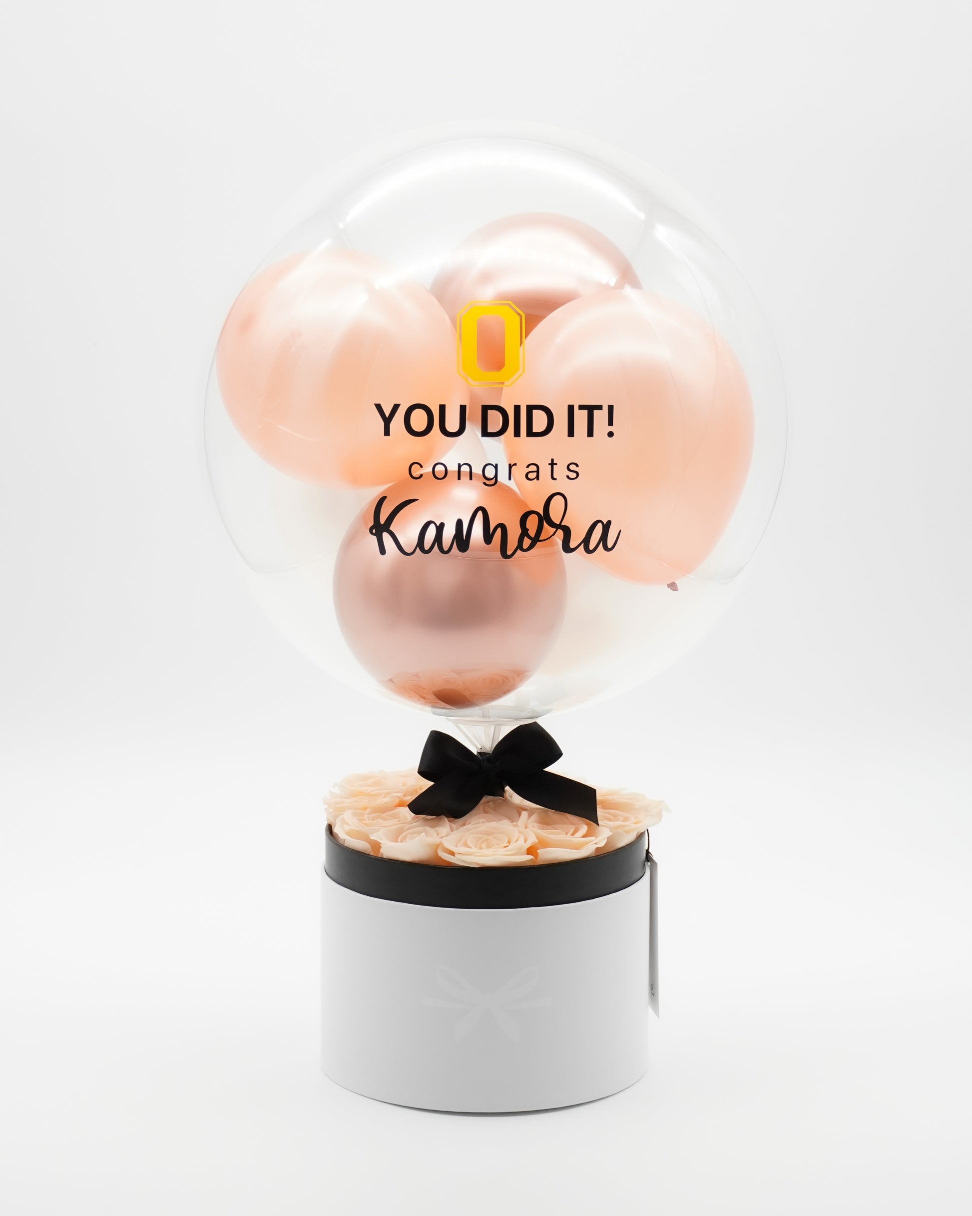 The Royal Box Classic features a medium sized Royal Balloon sitting above 16 scented preserved roses in the Modern Design round box. The beautifully preserved roses exude an irresistible scent, and can last up to a year without water and sunlight. With a heartwarming personalized message on the balloon, the Royal Box Classic makes the perfect gift or decor for occasions such as birthday, anniversary, baby shower, wedding, housewarming, and graduation.Â