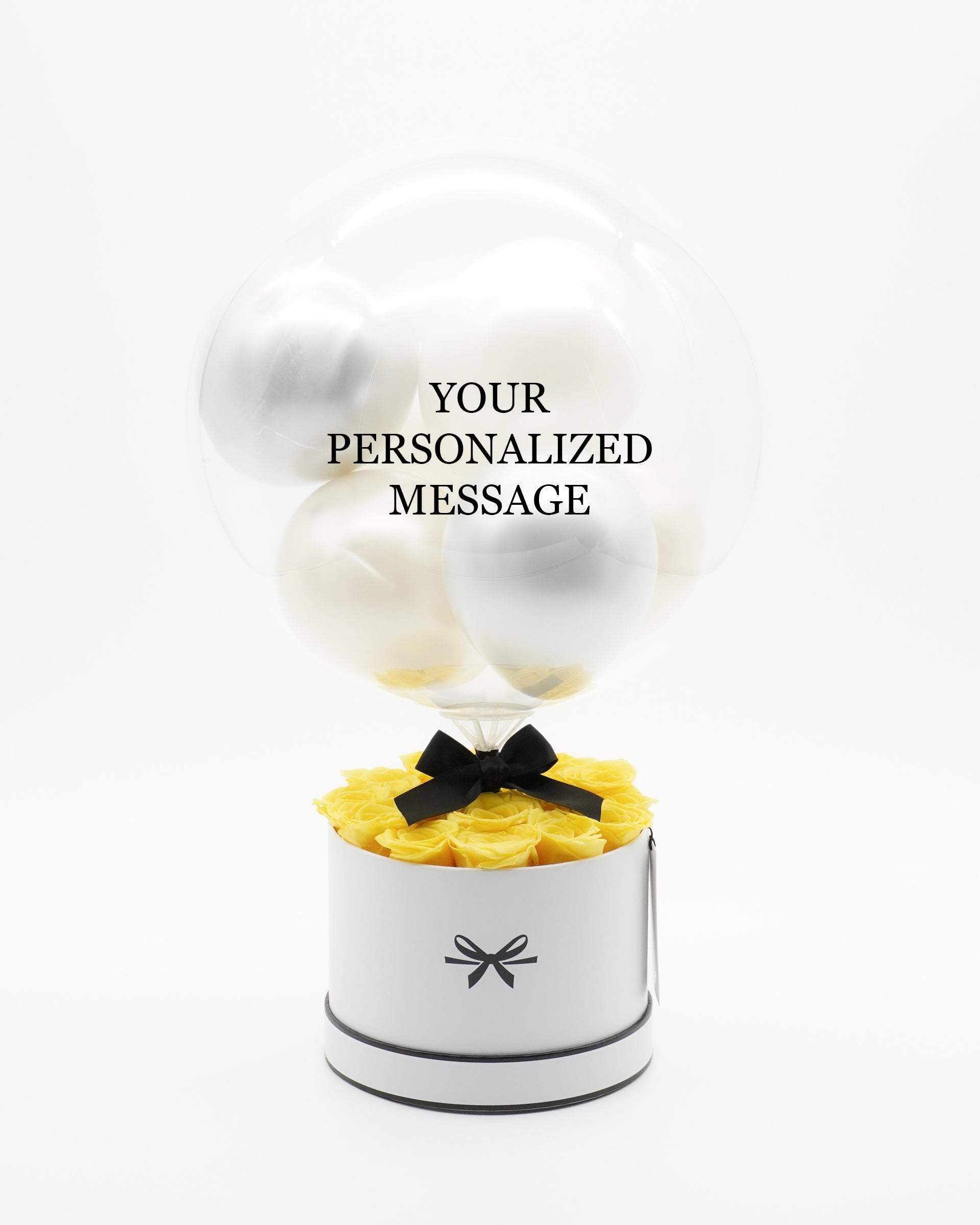 The Royal Box Classic features a medium sized Royal Balloon sitting above 16 scented preserved roses in the Modern Design round box. The beautifully preserved roses exude an irresistible scent, and can last up to a year without water and sunlight. With a heartwarming personalized message on the balloon, the Royal Box Classic makes the perfect gift or decor for occasions such as birthday, anniversary, baby shower, wedding, housewarming, and graduation.Â