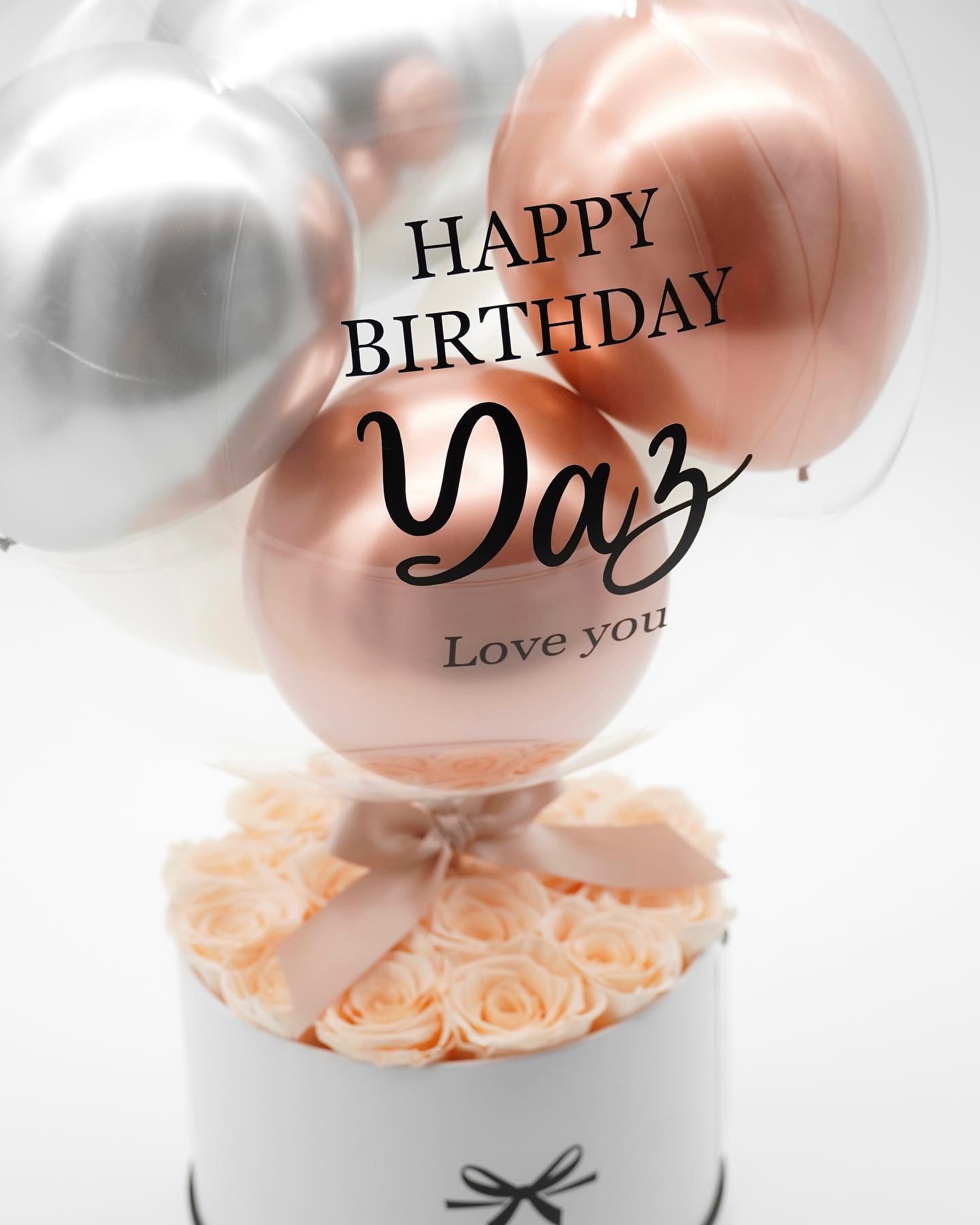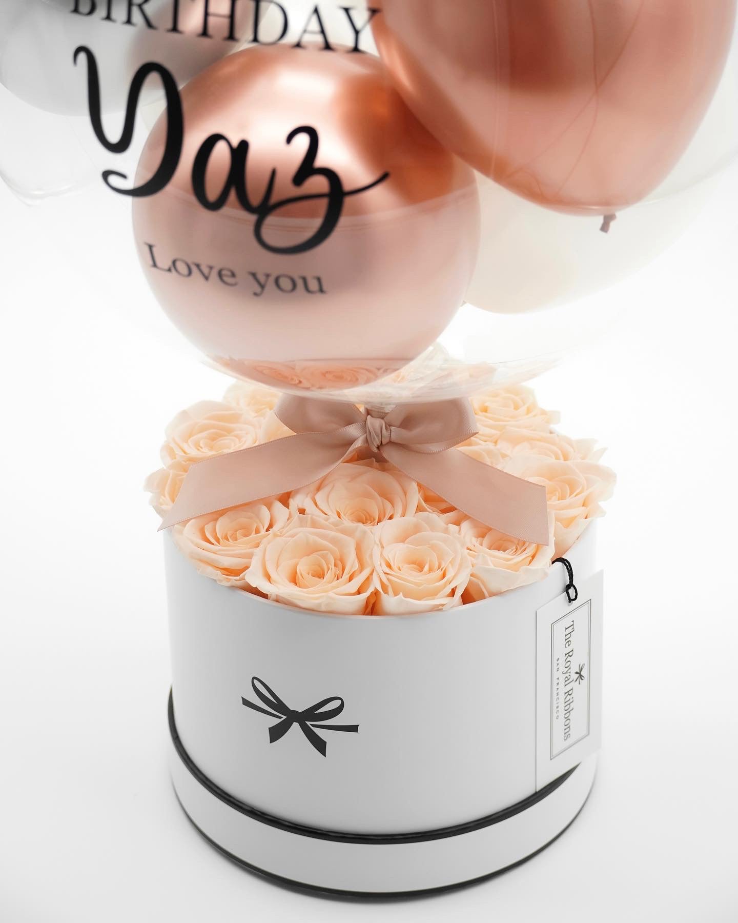 The Royal Box Classic features a medium sized Royal Balloon sitting above 16 scented preserved roses in the Modern Design round box. The beautifully preserved roses exude an irresistible scent, and can last up to a year without water and sunlight. With a heartwarming personalized message on the balloon, the Royal Box Classic makes the perfect gift or decor for occasions such as birthday, anniversary, baby shower, wedding, housewarming, and graduation.Â