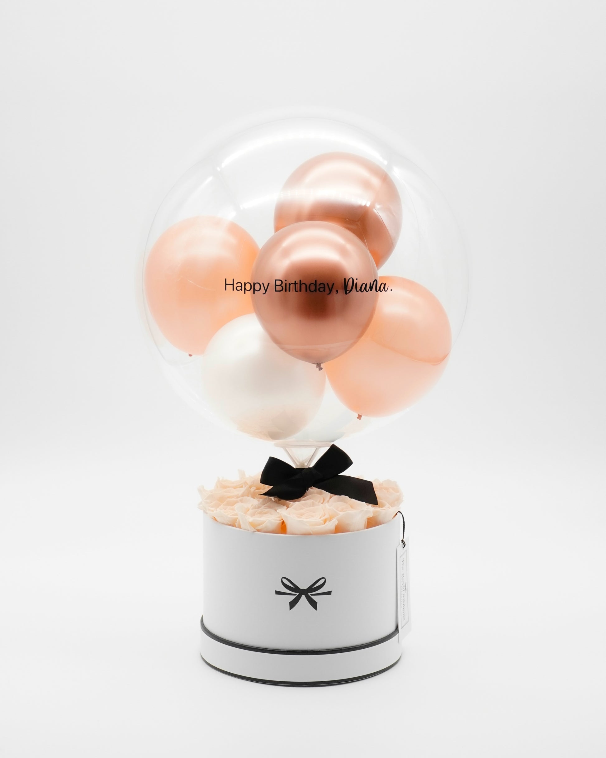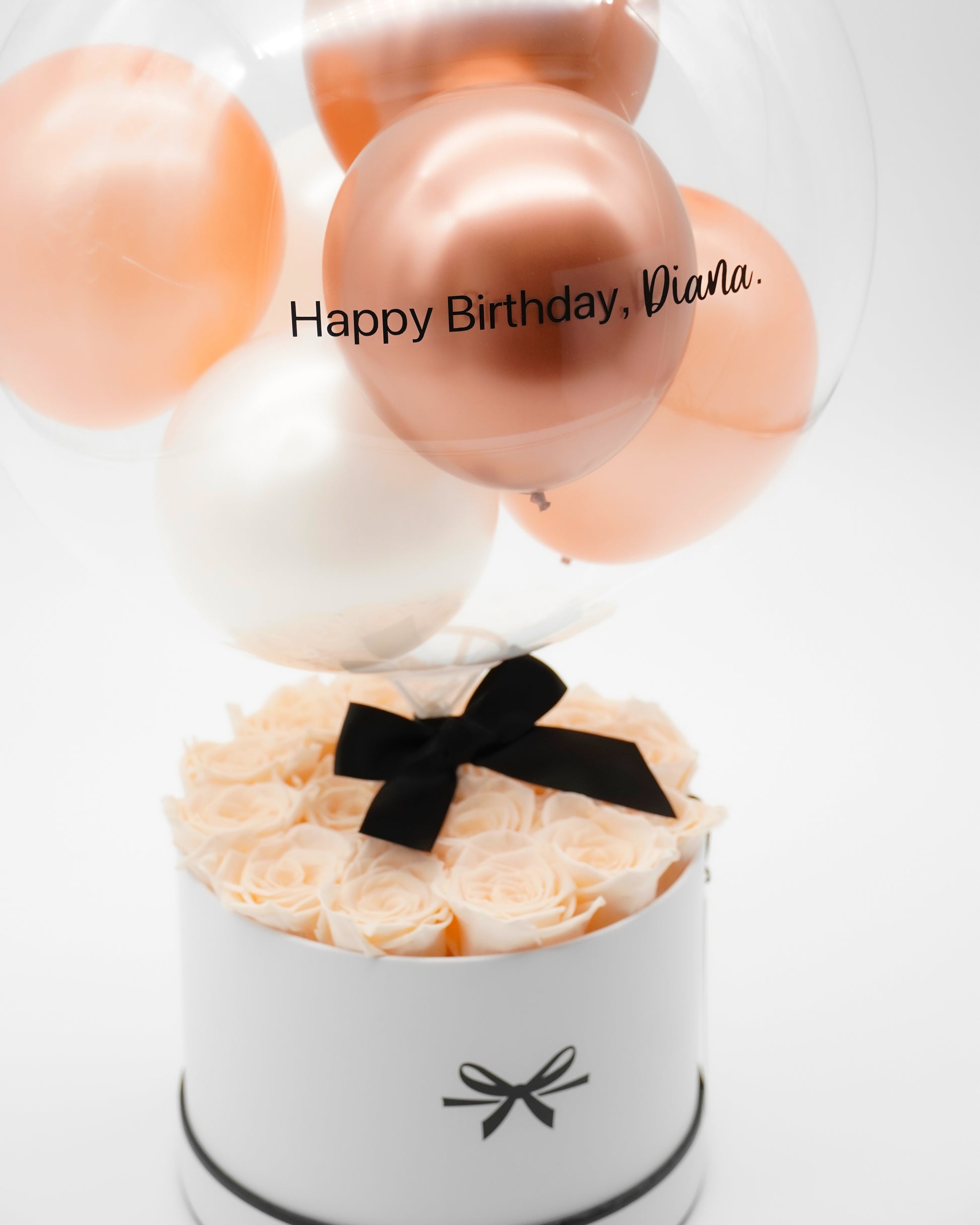 The Royal Box Classic features a medium sized Royal Balloon sitting above 16 scented preserved roses in the Modern Design round box. The beautifully preserved roses exude an irresistible scent, and can last up to a year without water and sunlight. With a heartwarming personalized message on the balloon, the Royal Box Classic makes the perfect gift or decor for occasions such as birthday, anniversary, baby shower, wedding, housewarming, and graduation.Â