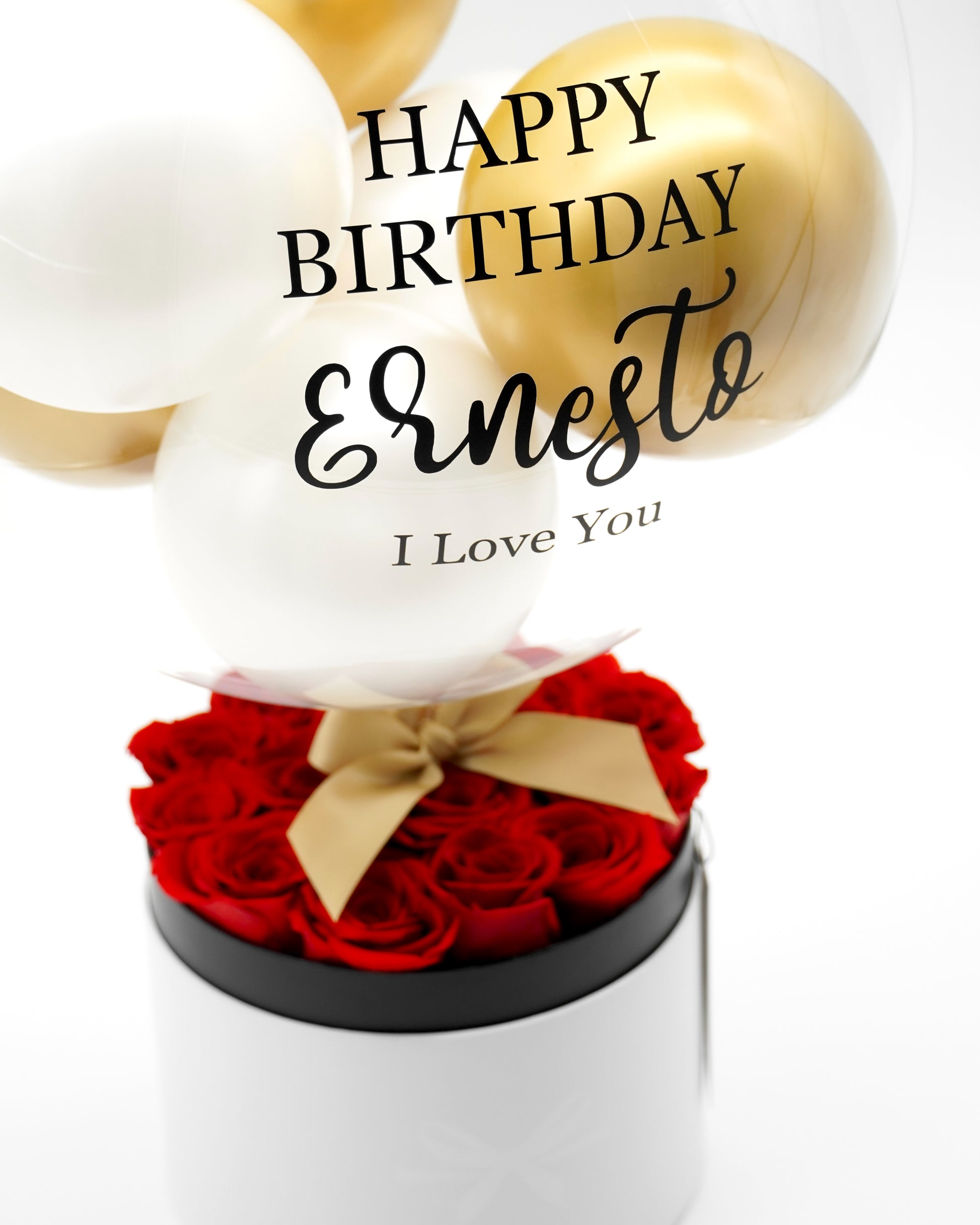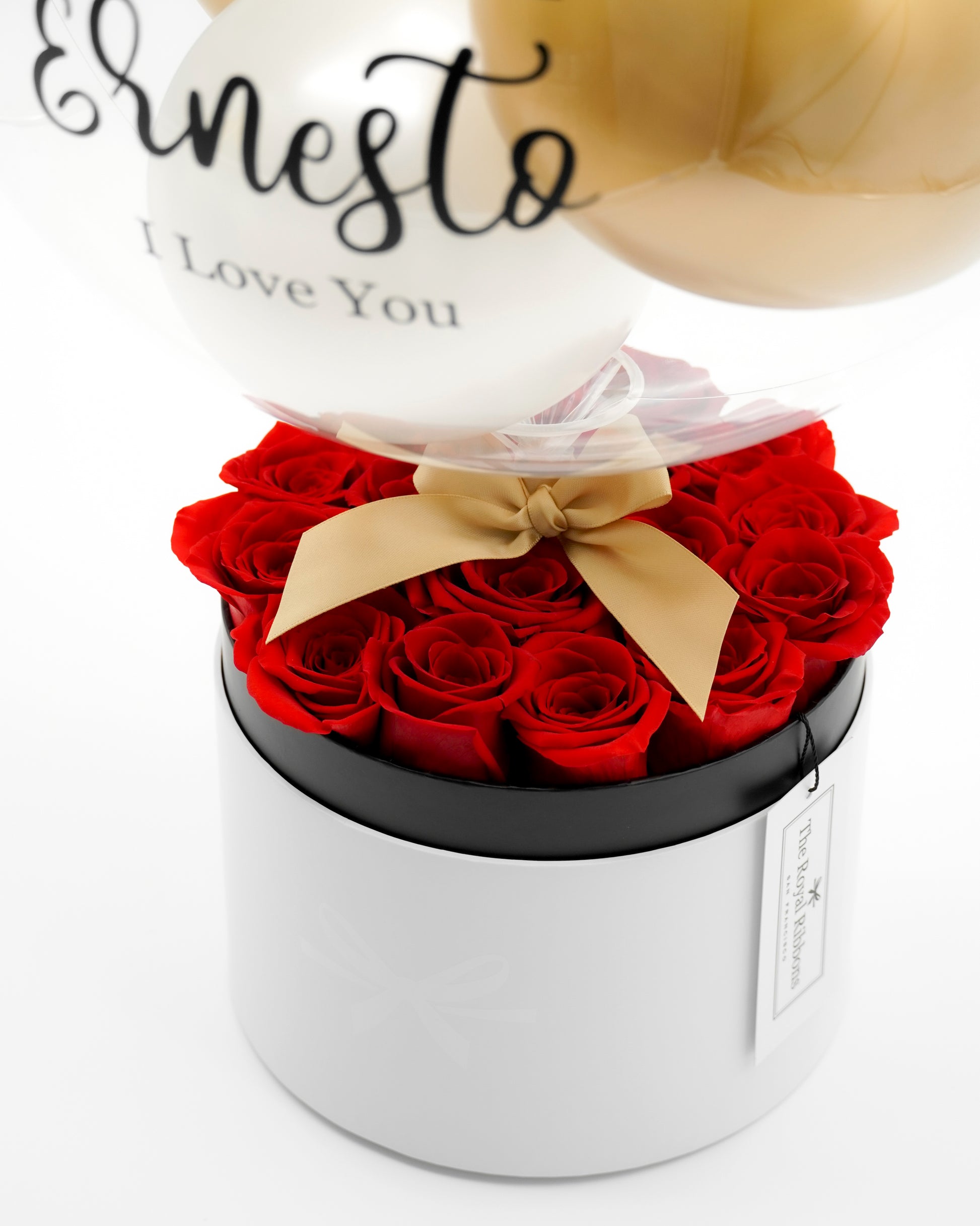 The Royal Box Classic features a medium sized Royal Balloon sitting above 16 scented preserved roses in the Modern Design round box. The beautifully preserved roses exude an irresistible scent, and can last up to a year without water and sunlight. With a heartwarming personalized message on the balloon, the Royal Box Classic makes the perfect gift or decor for occasions such as birthday, anniversary, baby shower, wedding, housewarming, and graduation.Â