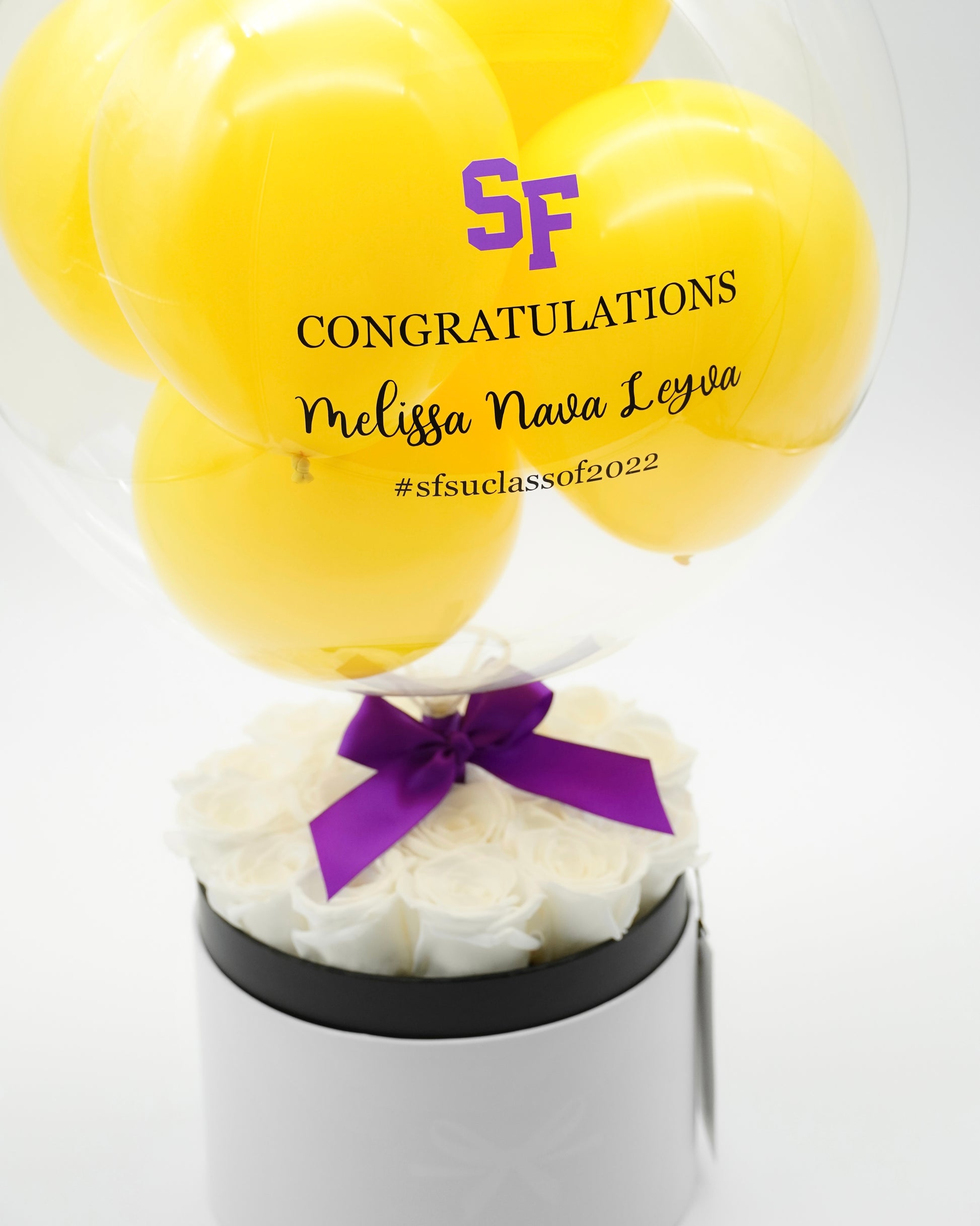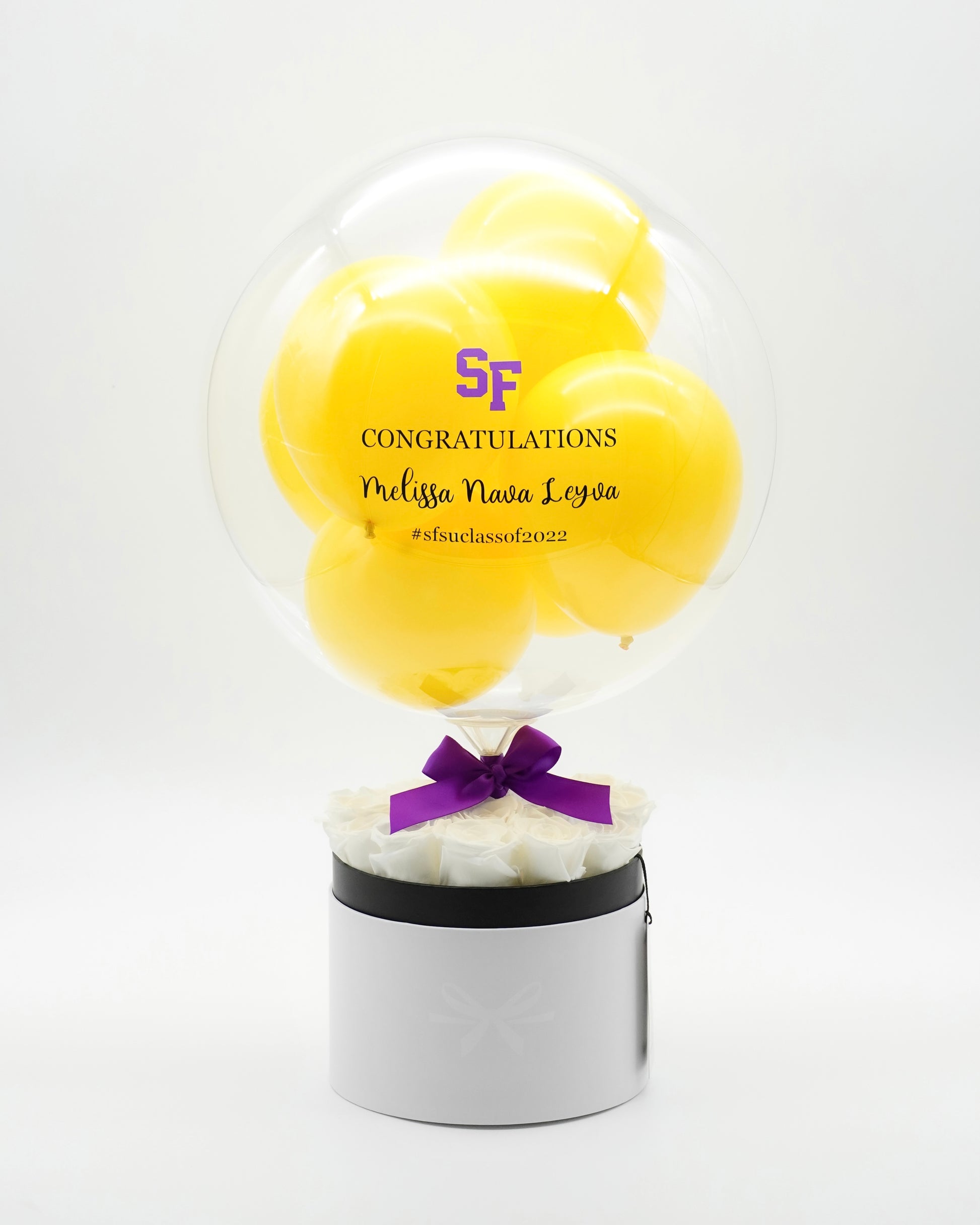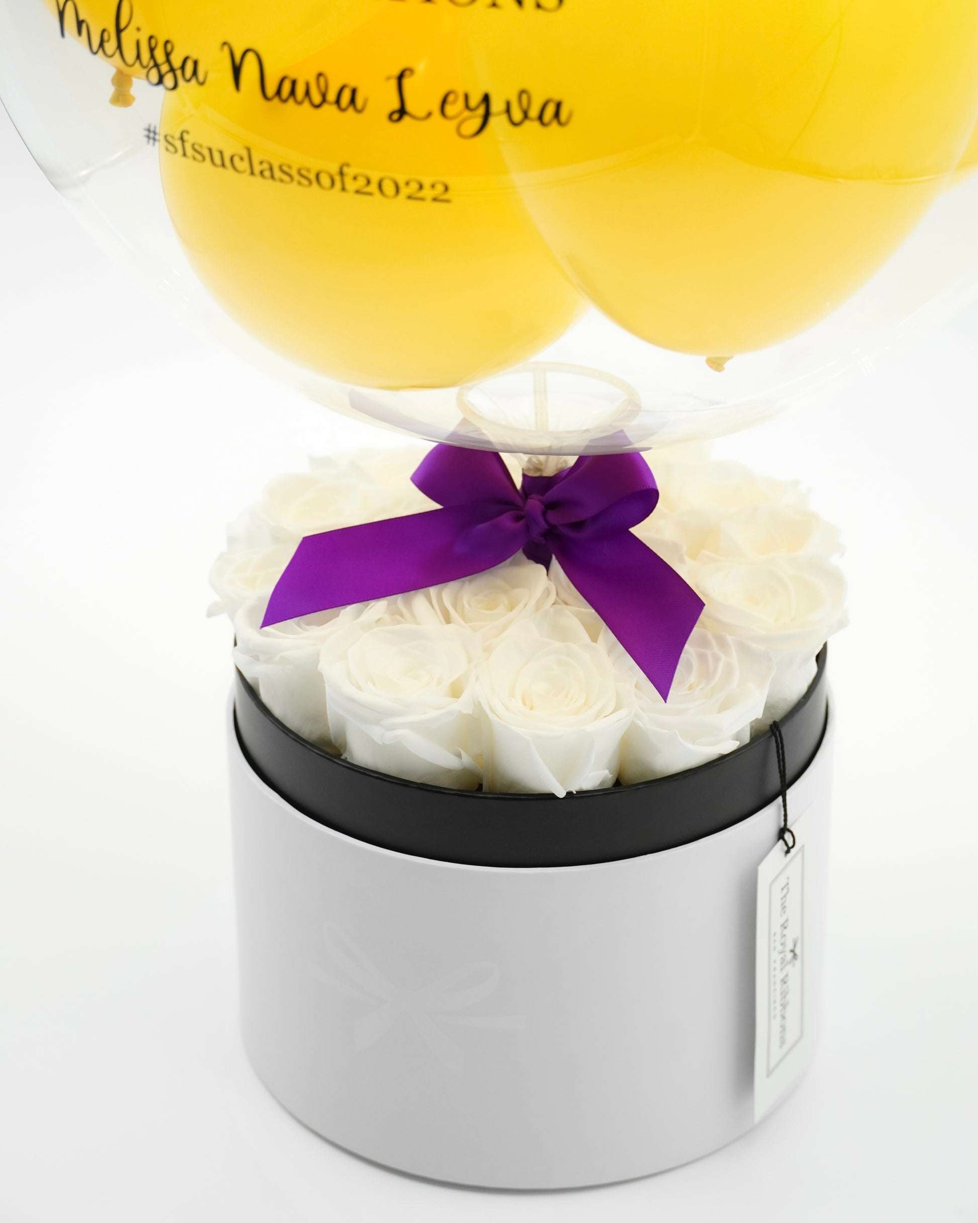 The Royal Box Classic features a medium sized Royal Balloon sitting above 16 scented preserved roses in the Modern Design round box. The beautifully preserved roses exude an irresistible scent, and can last up to a year without water and sunlight. With a heartwarming personalized message on the balloon, the Royal Box Classic makes the perfect gift or decor for occasions such as birthday, anniversary, baby shower, wedding, housewarming, and graduation.Â