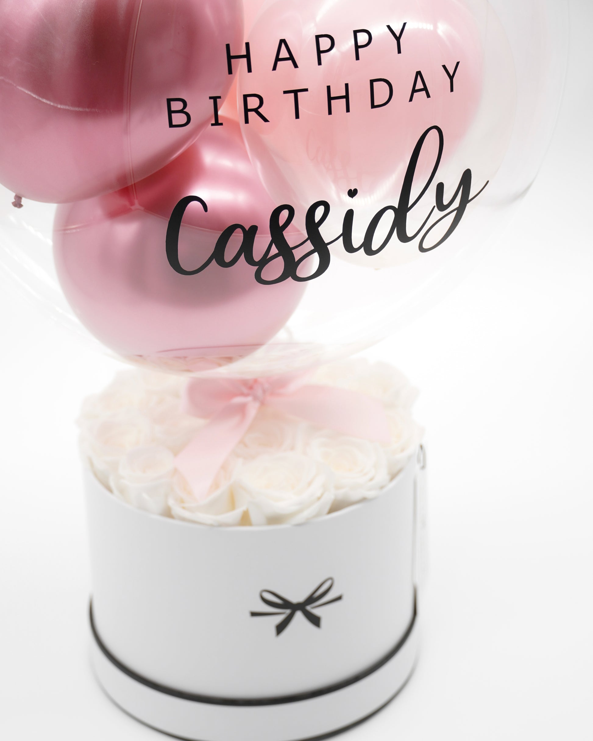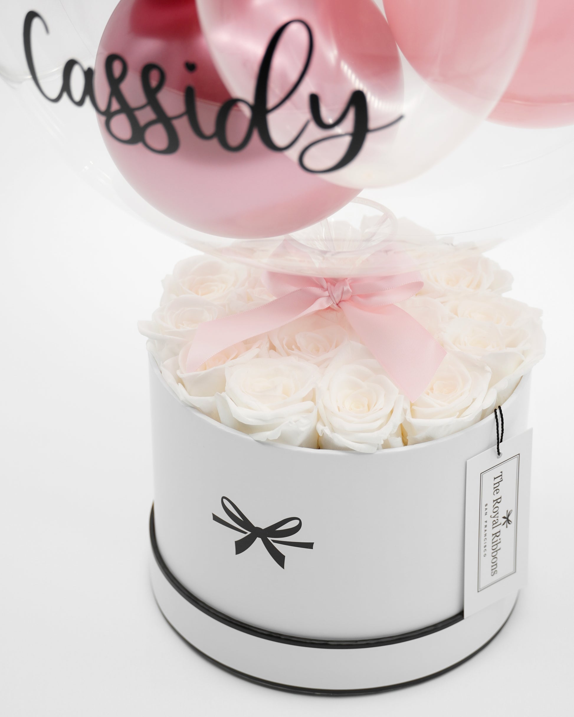 The Royal Box Classic features a medium sized Royal Balloon sitting above 16 scented preserved roses in the Modern Design round box. The beautifully preserved roses exude an irresistible scent, and can last up to a year without water and sunlight. With a heartwarming personalized message on the balloon, the Royal Box Classic makes the perfect gift or decor for occasions such as birthday, anniversary, baby shower, wedding, housewarming, and graduation.Â