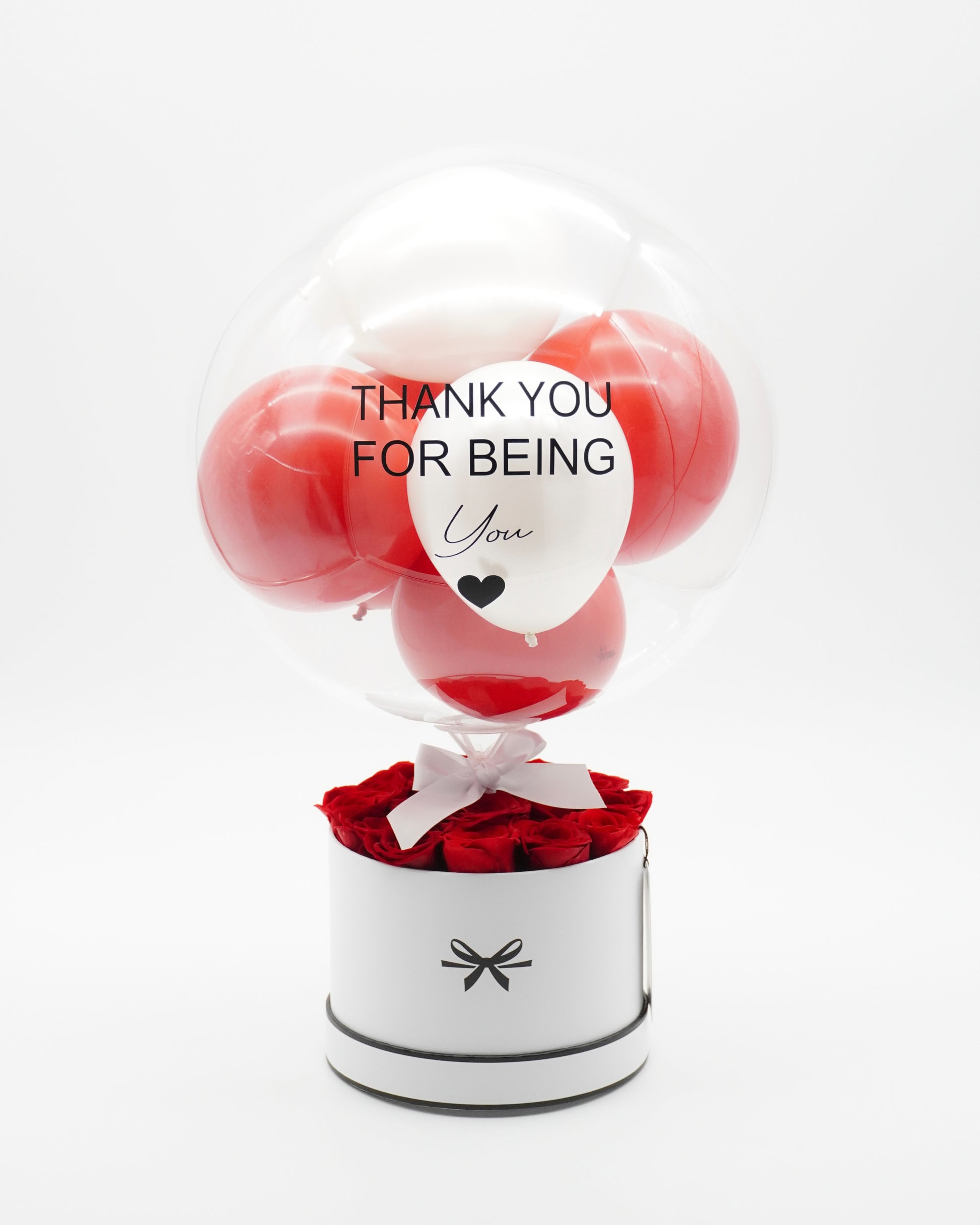 1 medium sized clear latex balloon, 6 mini balloons, 16 scented preserved roses, premium ribbon, your personalized message on the balloon & complimentary card (optional).