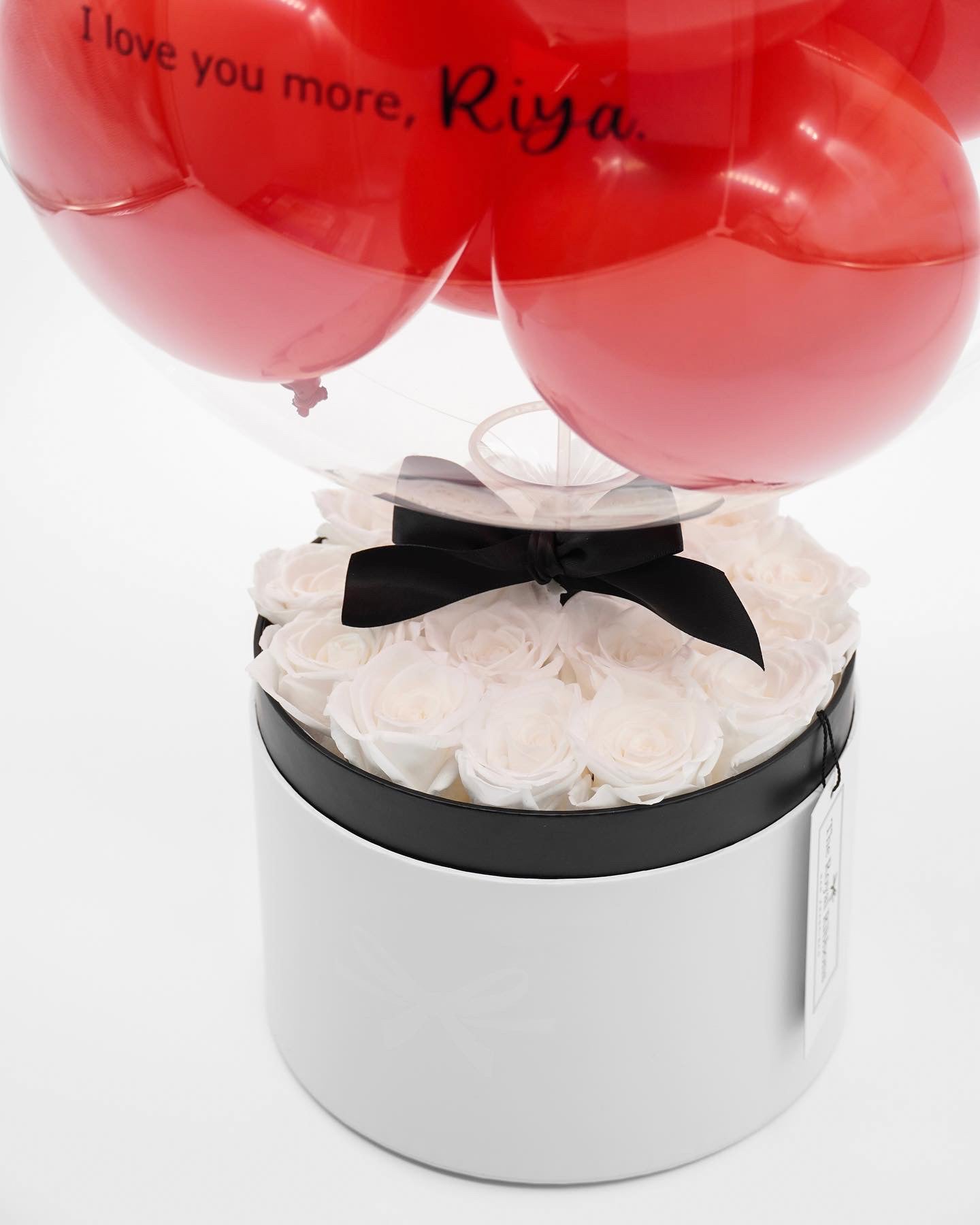 The Royal Box Classic features a medium sized Royal Balloon sitting above 16 scented preserved roses in the Modern Design round box. The beautifully preserved roses exude an irresistible scent, and can last up to a year without water and sunlight. With a heartwarming personalized message on the balloon, the Royal Box Classic makes the perfect gift or decor for occasions such as birthday, anniversary, baby shower, wedding, housewarming, and graduation.Â