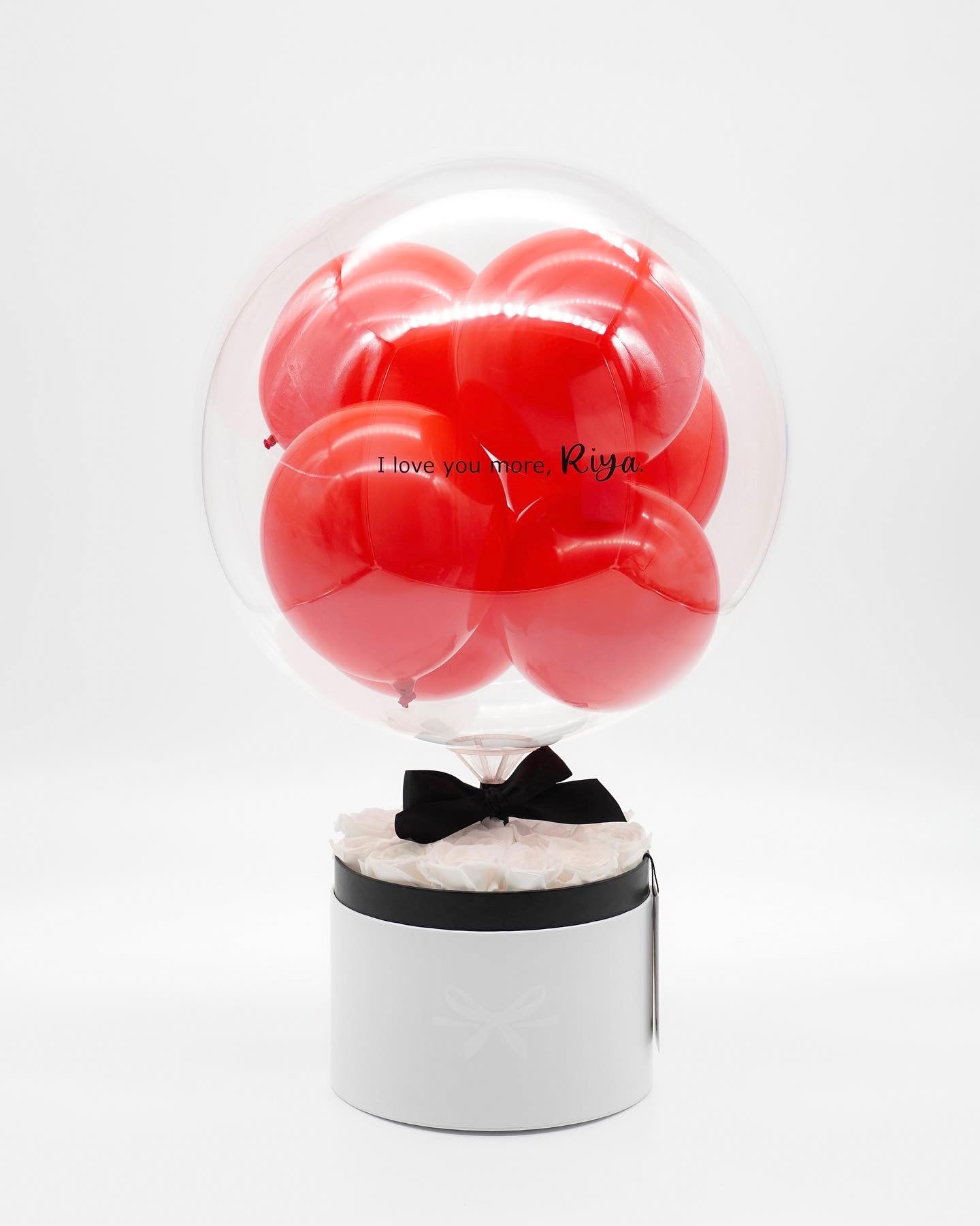 1 medium sized clear latex balloon, 6 mini balloons, 16 scented preserved roses, premium ribbon, your personalized message on the balloon & complimentary card (optional).