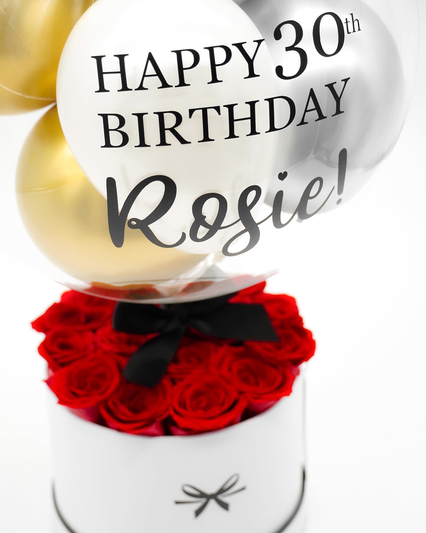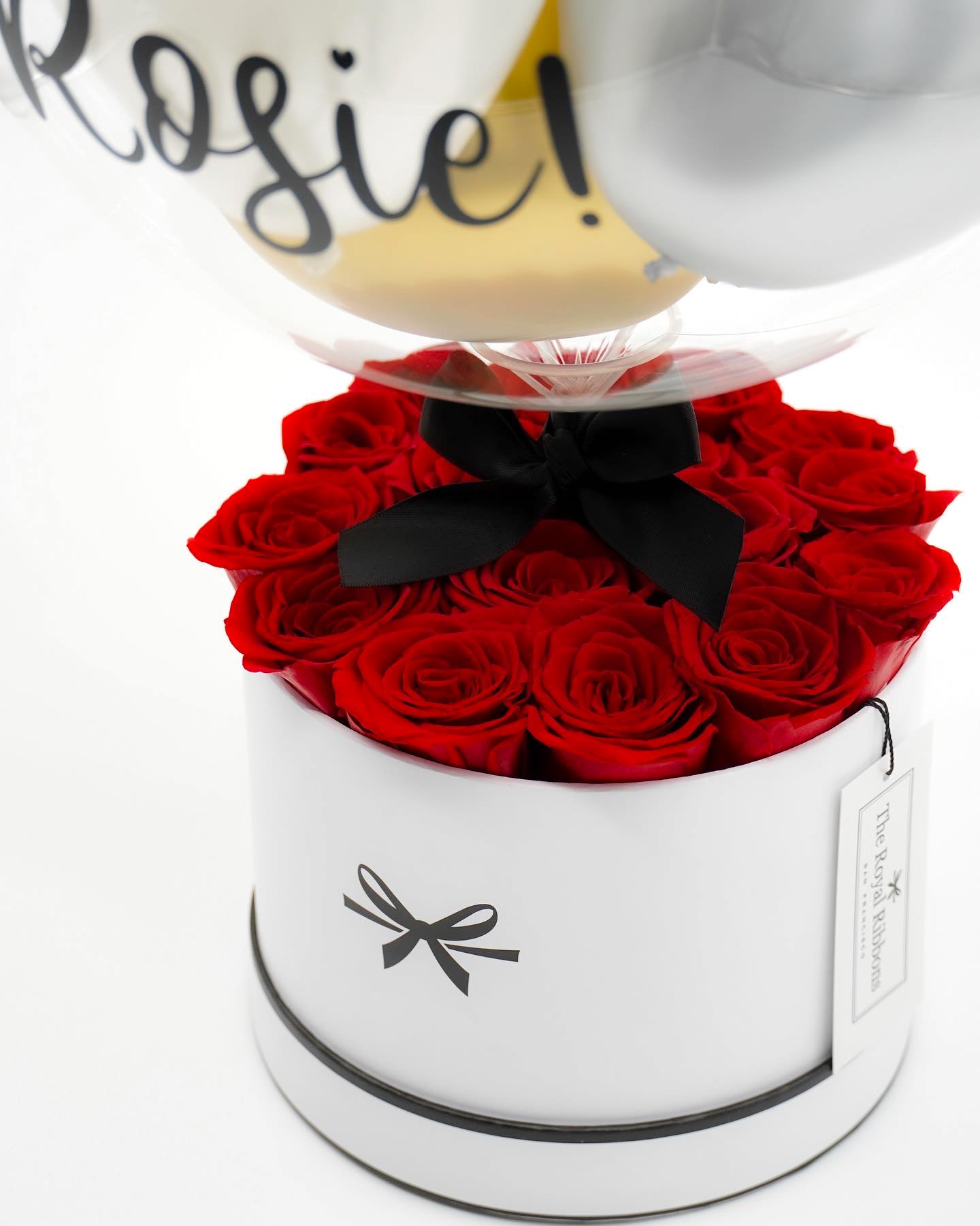 The Royal Box Classic features a medium sized Royal Balloon sitting above 16 scented preserved roses in the Modern Design round box. The beautifully preserved roses exude an irresistible scent, and can last up to a year without water and sunlight. With a heartwarming personalized message on the balloon, the Royal Box Classic makes the perfect gift or decor for occasions such as birthday, anniversary, baby shower, wedding, housewarming, and graduation.Â