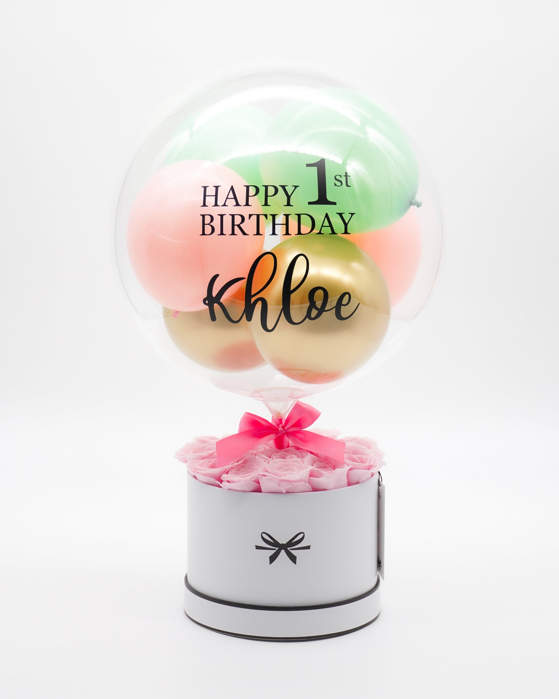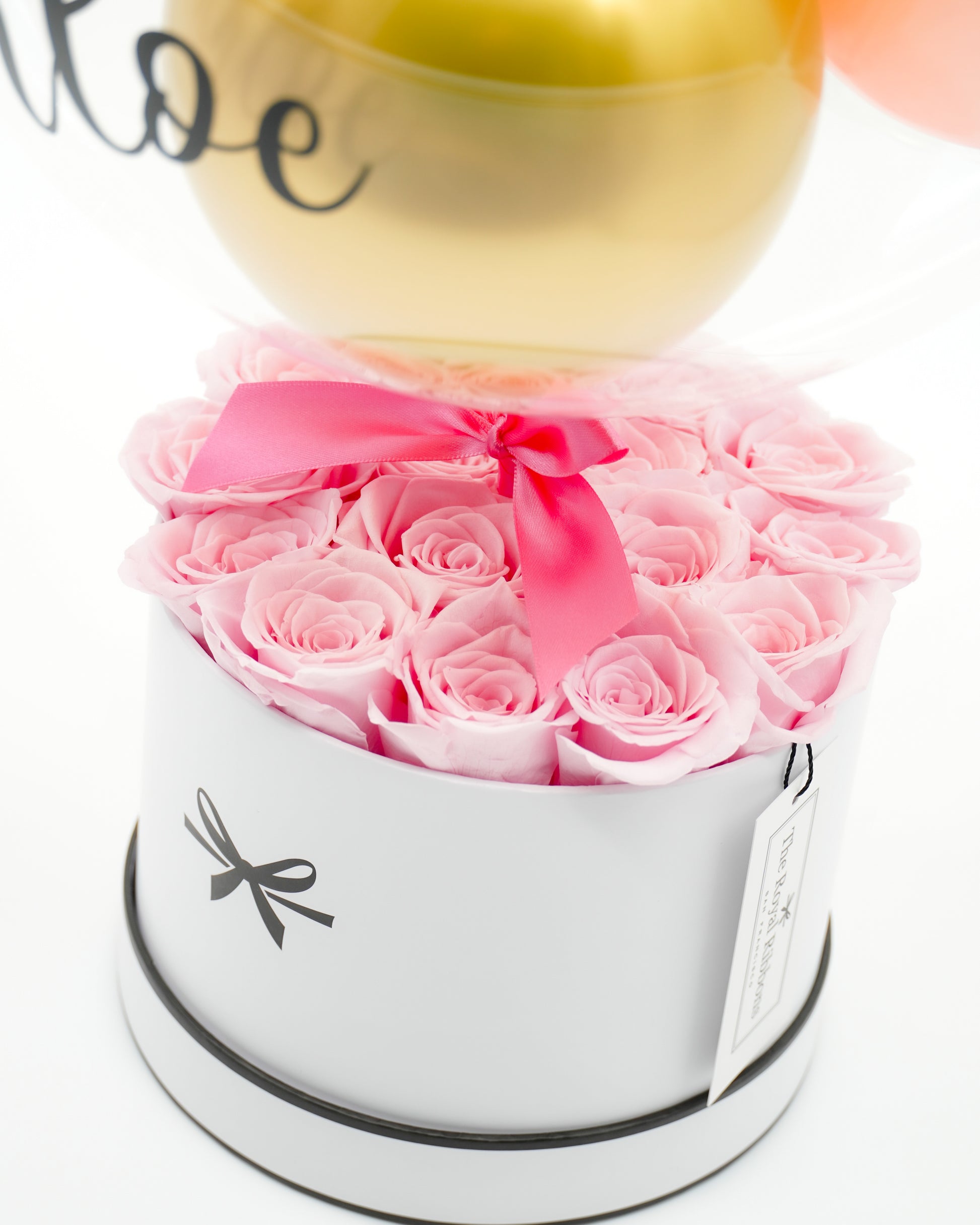 The Royal Box Classic features a medium sized Royal Balloon sitting above 16 scented preserved roses in the Modern Design round box. The beautifully preserved roses exude an irresistible scent, and can last up to a year without water and sunlight. With a heartwarming personalized message on the balloon, the Royal Box Classic makes the perfect gift or decor for occasions such as birthday, anniversary, baby shower, wedding, housewarming, and graduation.Â
