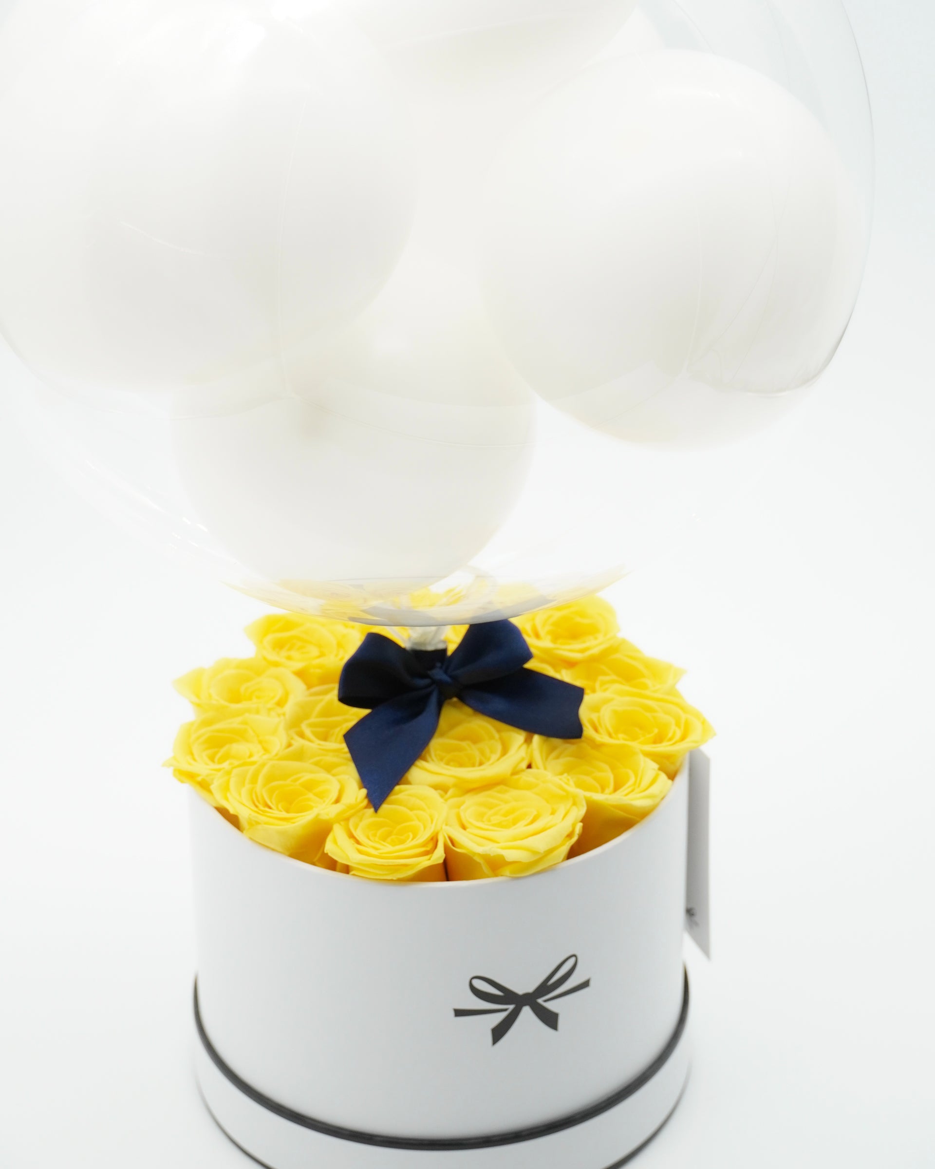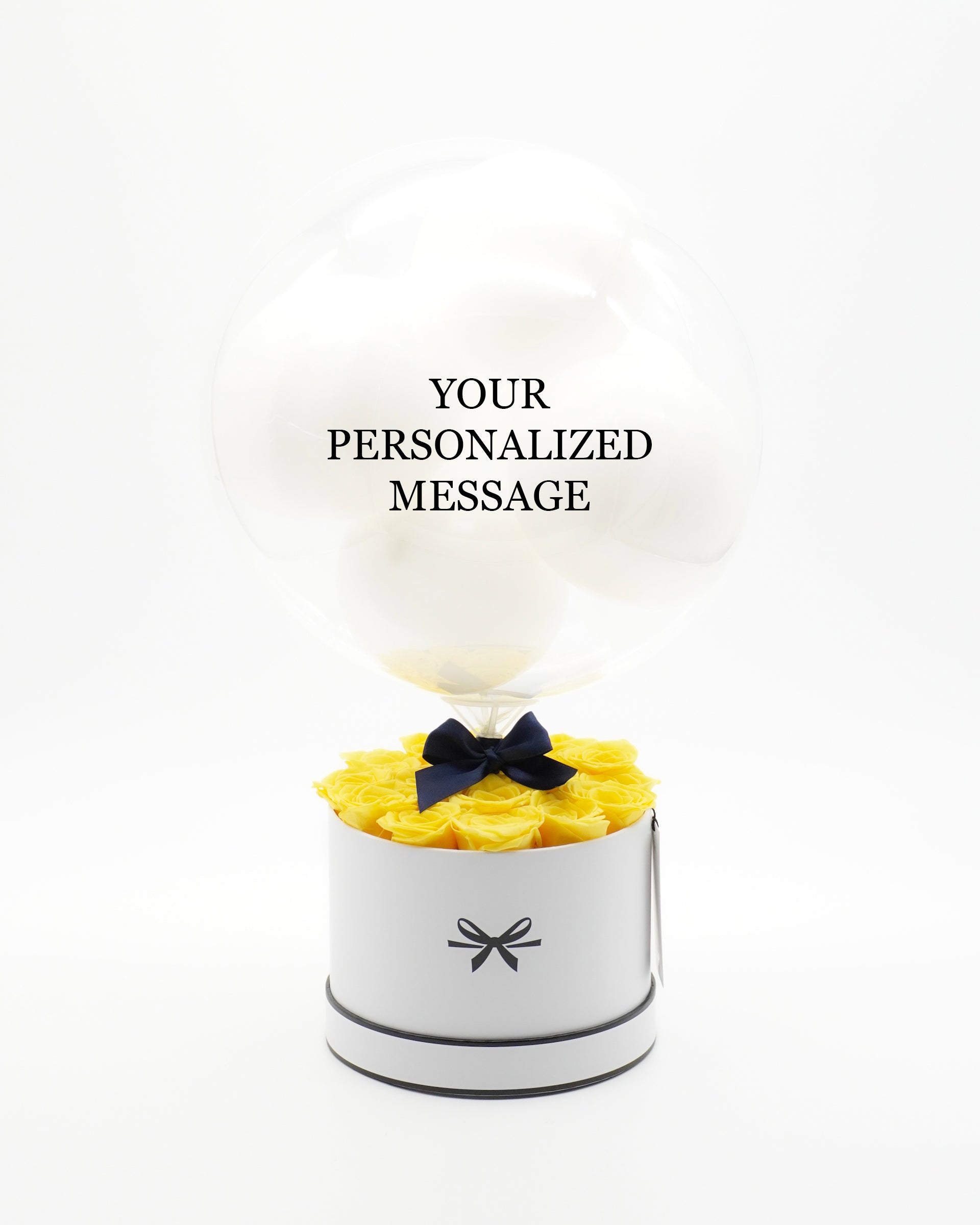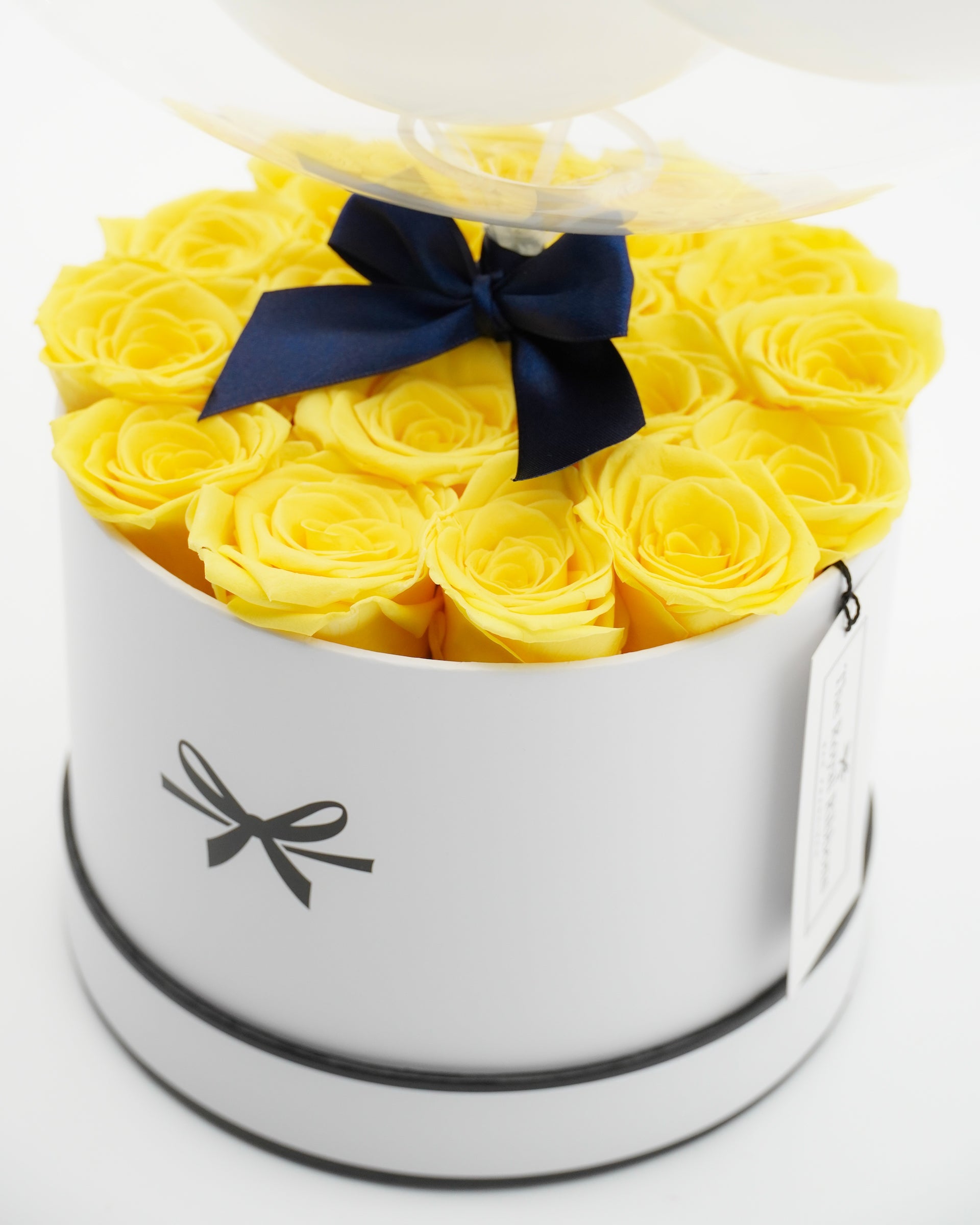 The Royal Box Classic features a medium sized Royal Balloon sitting above 16 scented preserved roses in the Modern Design round box. The beautifully preserved roses exude an irresistible scent, and can last up to a year without water and sunlight. With a heartwarming personalized message on the balloon, the Royal Box Classic makes the perfect gift or decor for occasions such as birthday, anniversary, baby shower, wedding, housewarming, and graduation.Â