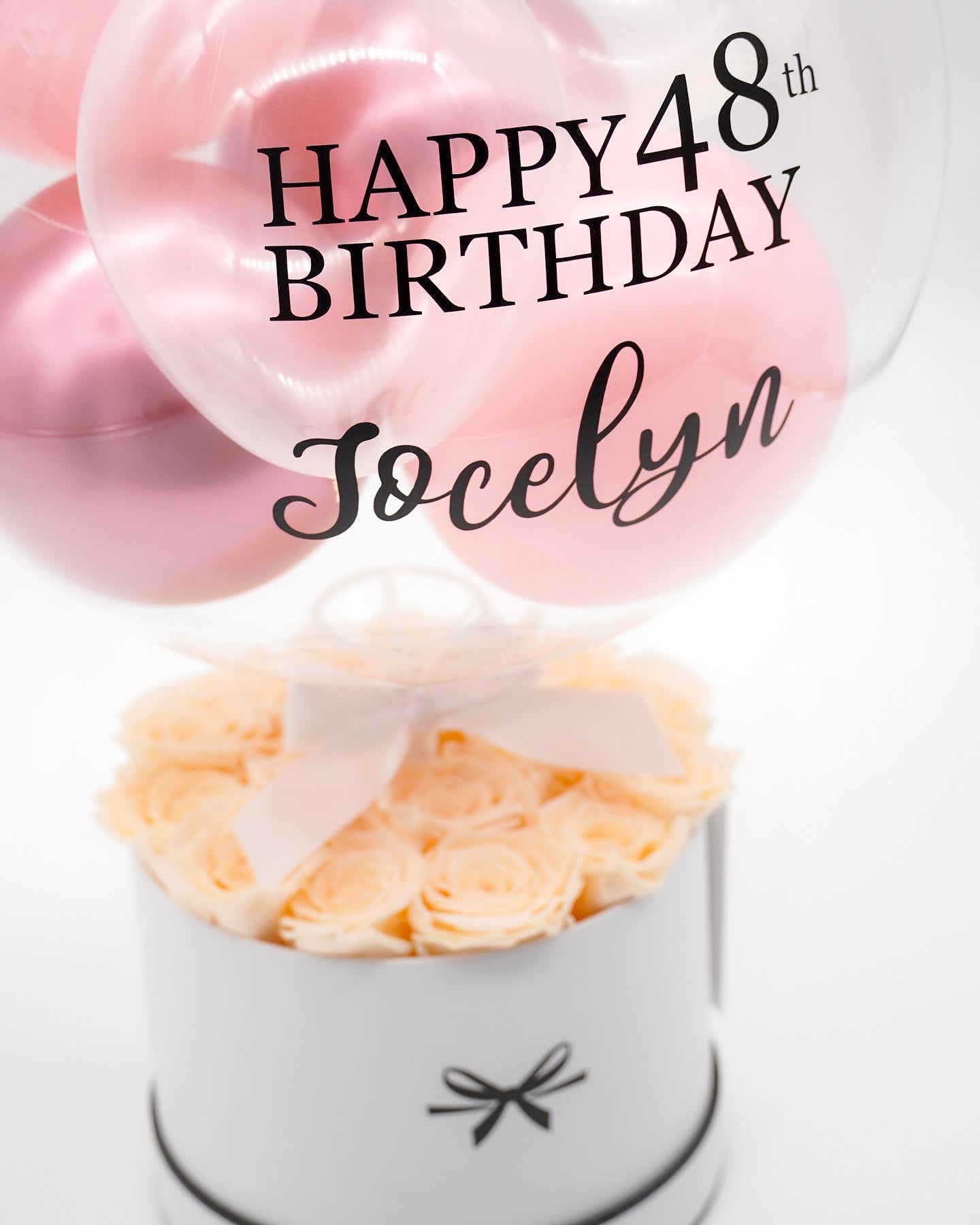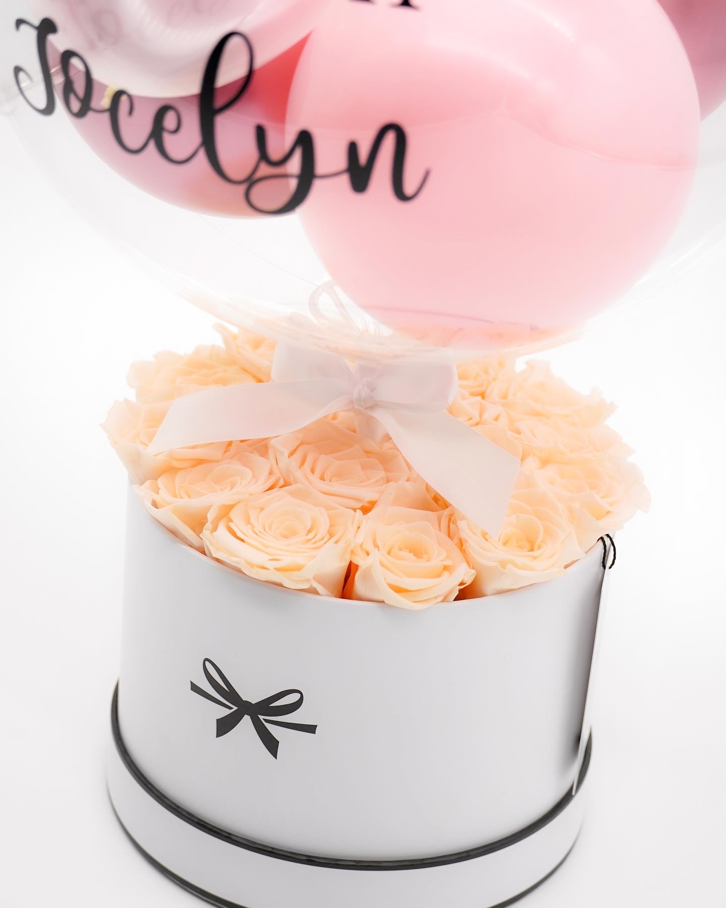 The Royal Box Classic features a medium sized Royal Balloon sitting above 16 scented preserved roses in the Modern Design round box. The beautifully preserved roses exude an irresistible scent, and can last up to a year without water and sunlight. With a heartwarming personalized message on the balloon, the Royal Box Classic makes the perfect gift or decor for occasions such as birthday, anniversary, baby shower, wedding, housewarming, and graduation.Â