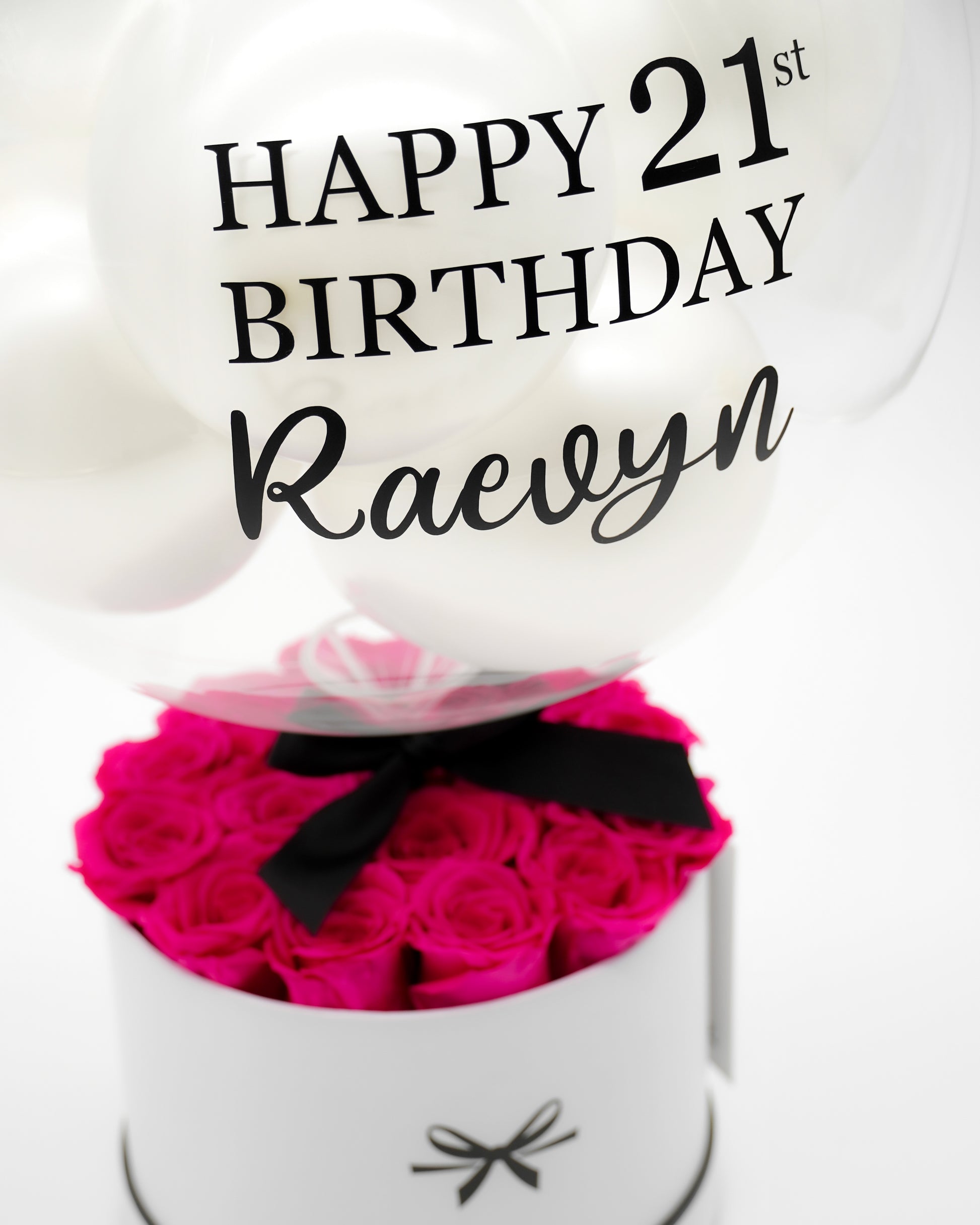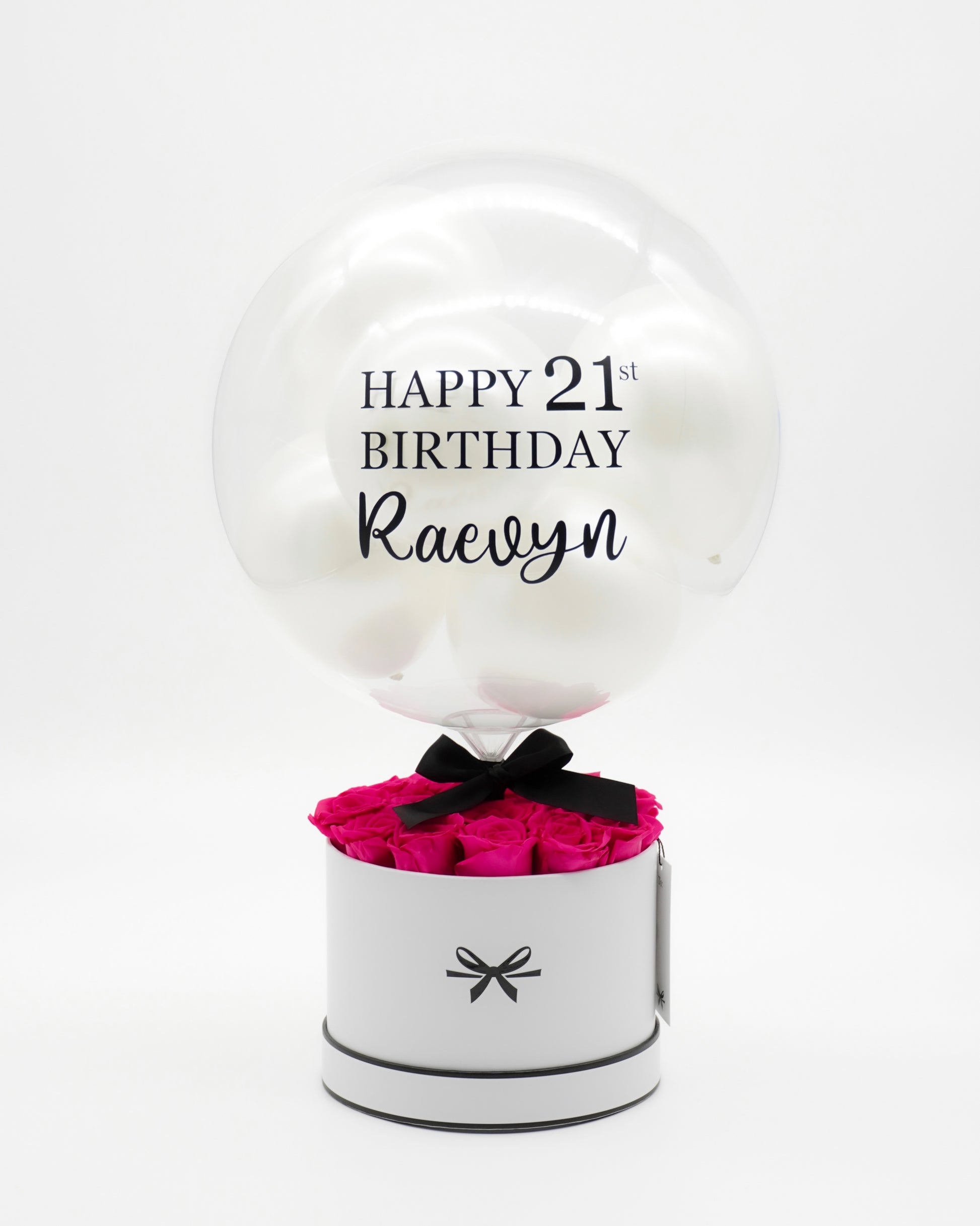The Royal Box Classic features a medium sized Royal Balloon sitting above 16 scented preserved roses in the Modern Design round box. The beautifully preserved roses exude an irresistible scent, and can last up to a year without water and sunlight. With a heartwarming personalized message on the balloon, the Royal Box Classic makes the perfect gift or decor for occasions such as birthday, anniversary, baby shower, wedding, housewarming, and graduation.Â