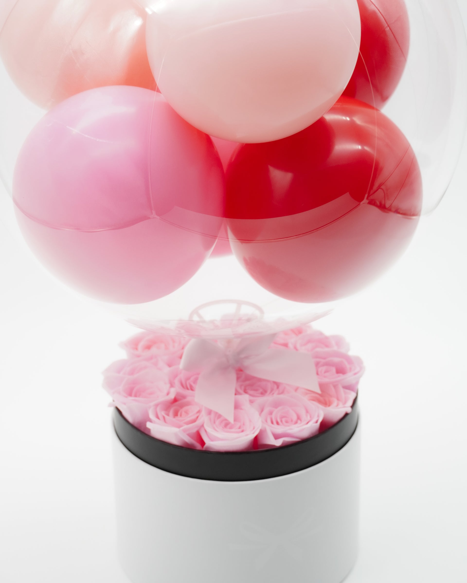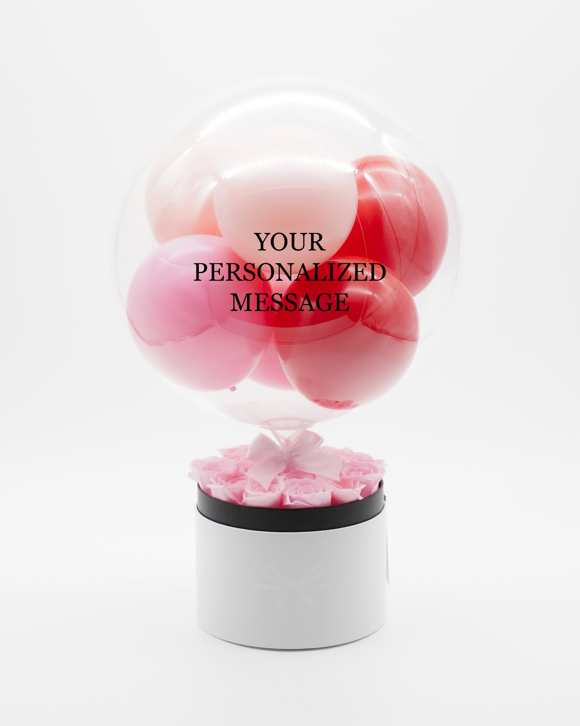 1 medium sized clear latex balloon, 6 mini balloons, 16 scented preserved roses, premium ribbon, your personalized message on the balloon & complimentary card (optional).