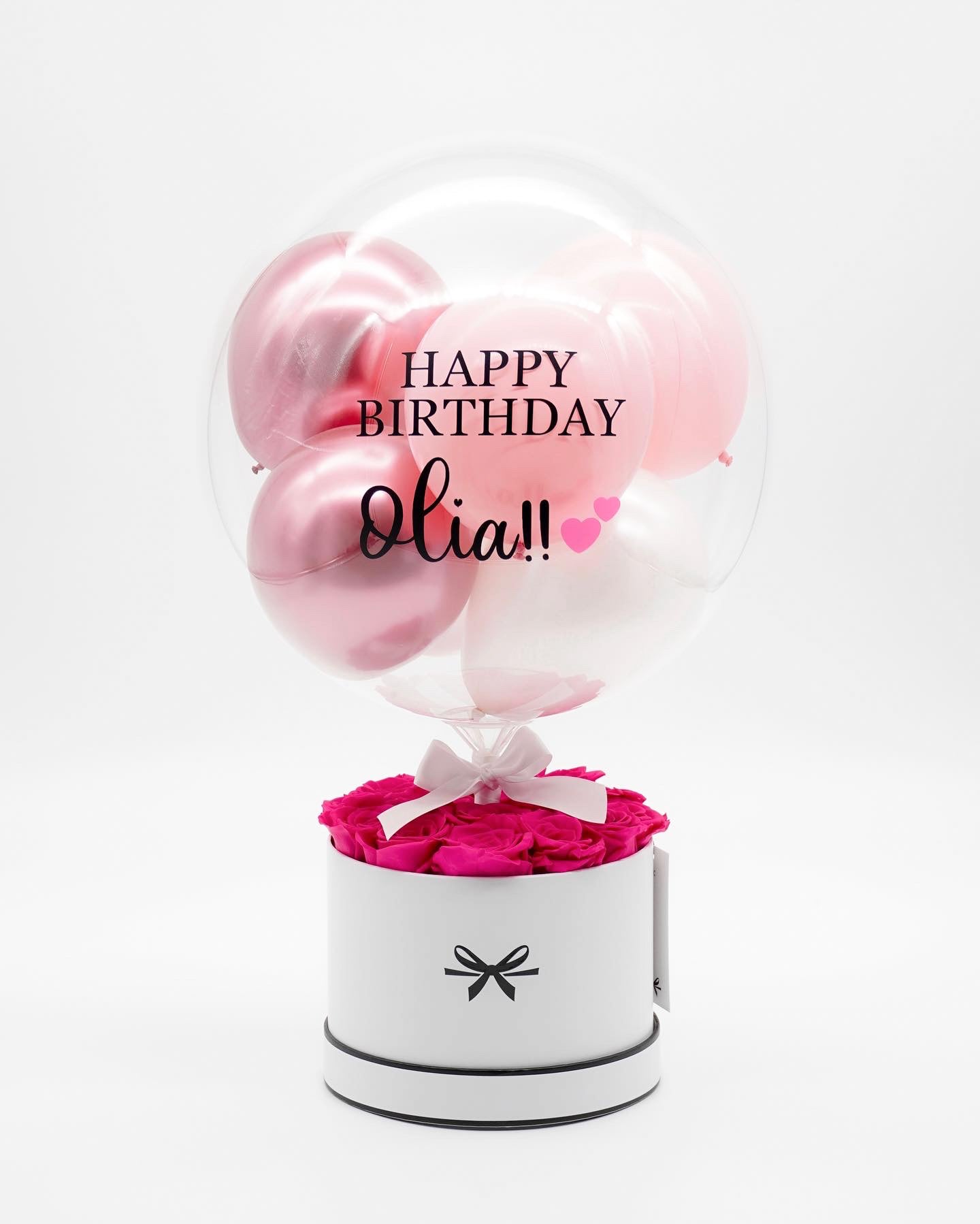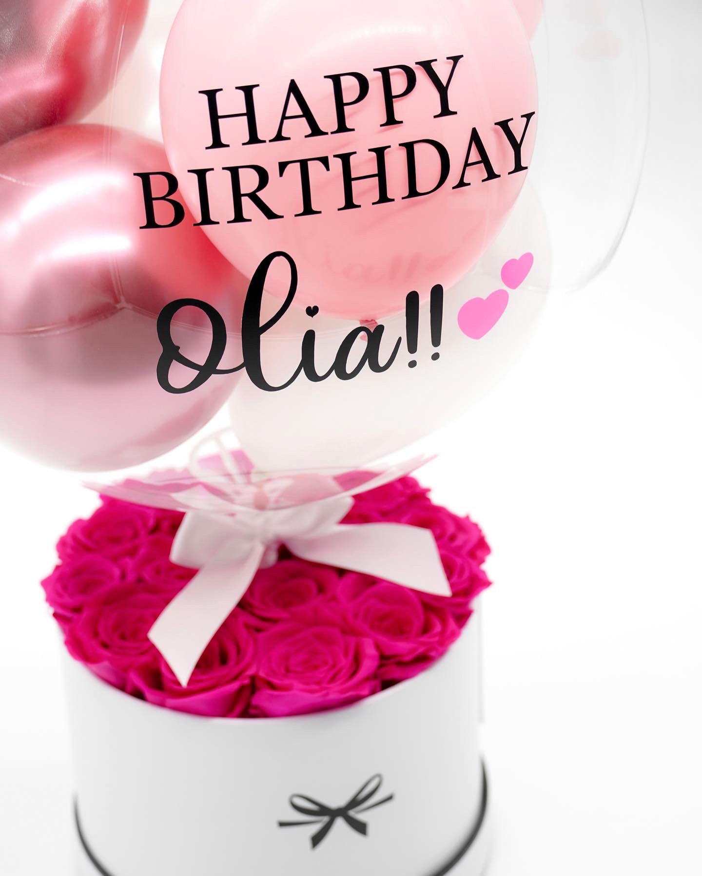 The Royal Box Classic features a medium sized Royal Balloon sitting above 16 scented preserved roses in the Modern Design round box. The beautifully preserved roses exude an irresistible scent, and can last up to a year without water and sunlight. With a heartwarming personalized message on the balloon, the Royal Box Classic makes the perfect gift or decor for occasions such as birthday, anniversary, baby shower, wedding, housewarming, and graduation.Â