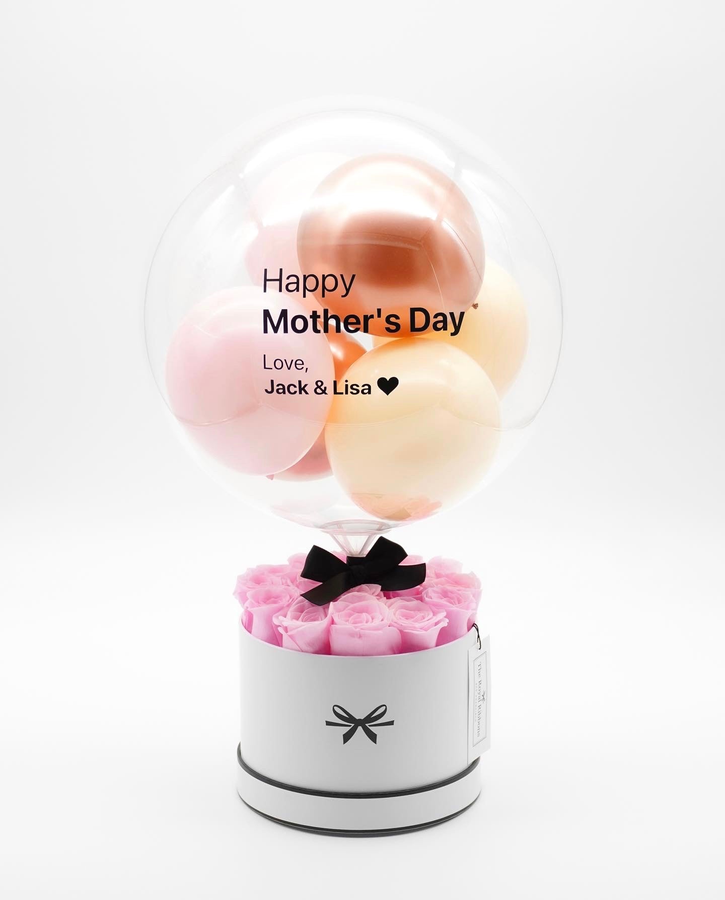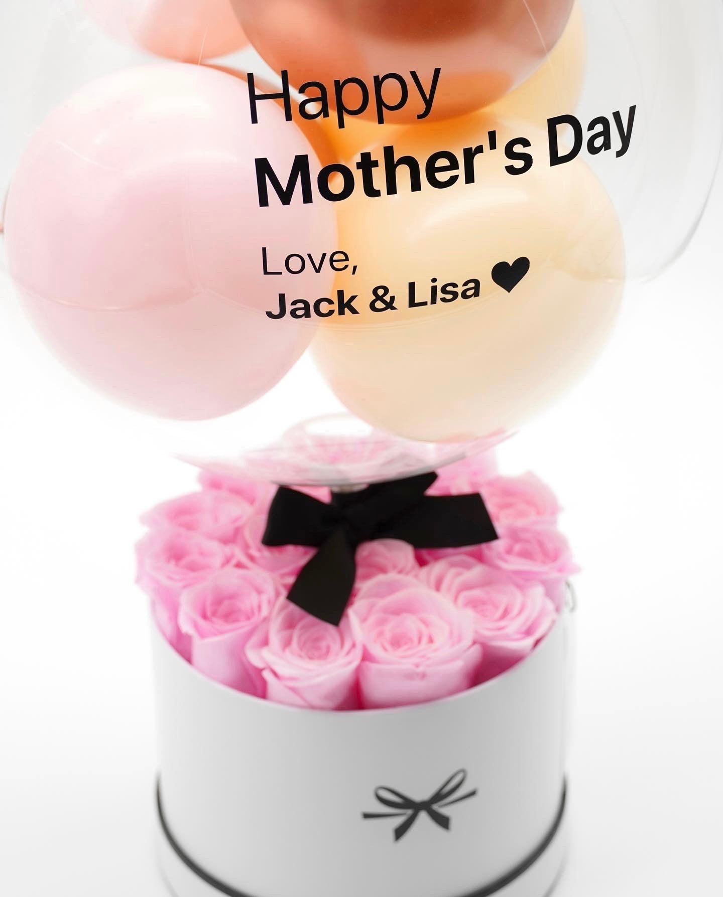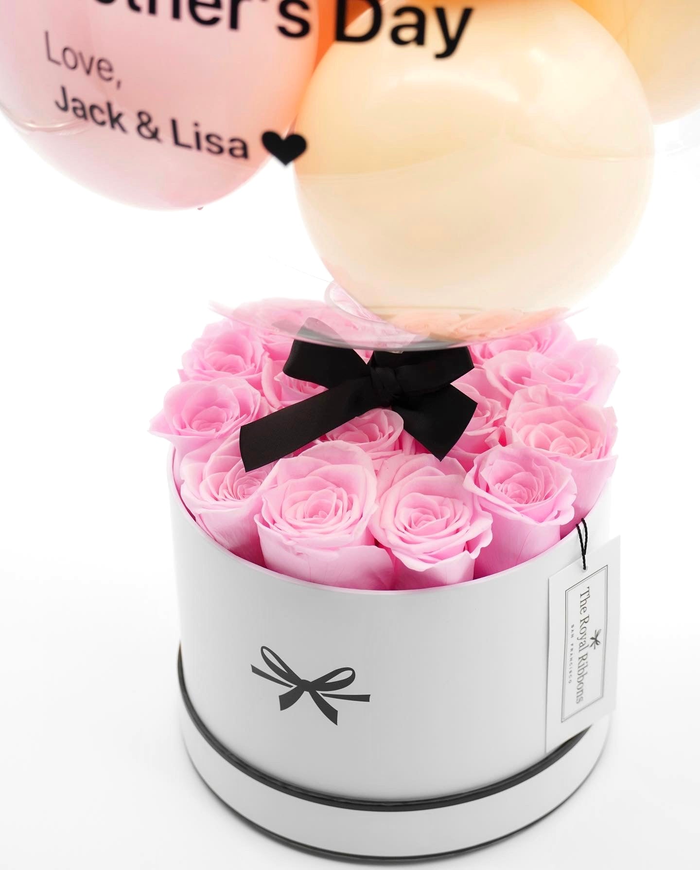 The Royal Box Classic features a medium sized Royal Balloon sitting above 16 scented preserved roses in the Modern Design round box. The beautifully preserved roses exude an irresistible scent, and can last up to a year without water and sunlight. With a heartwarming personalized message on the balloon, the Royal Box Classic makes the perfect gift or decor for occasions such as birthday, anniversary, baby shower, wedding, housewarming, and graduation.Â