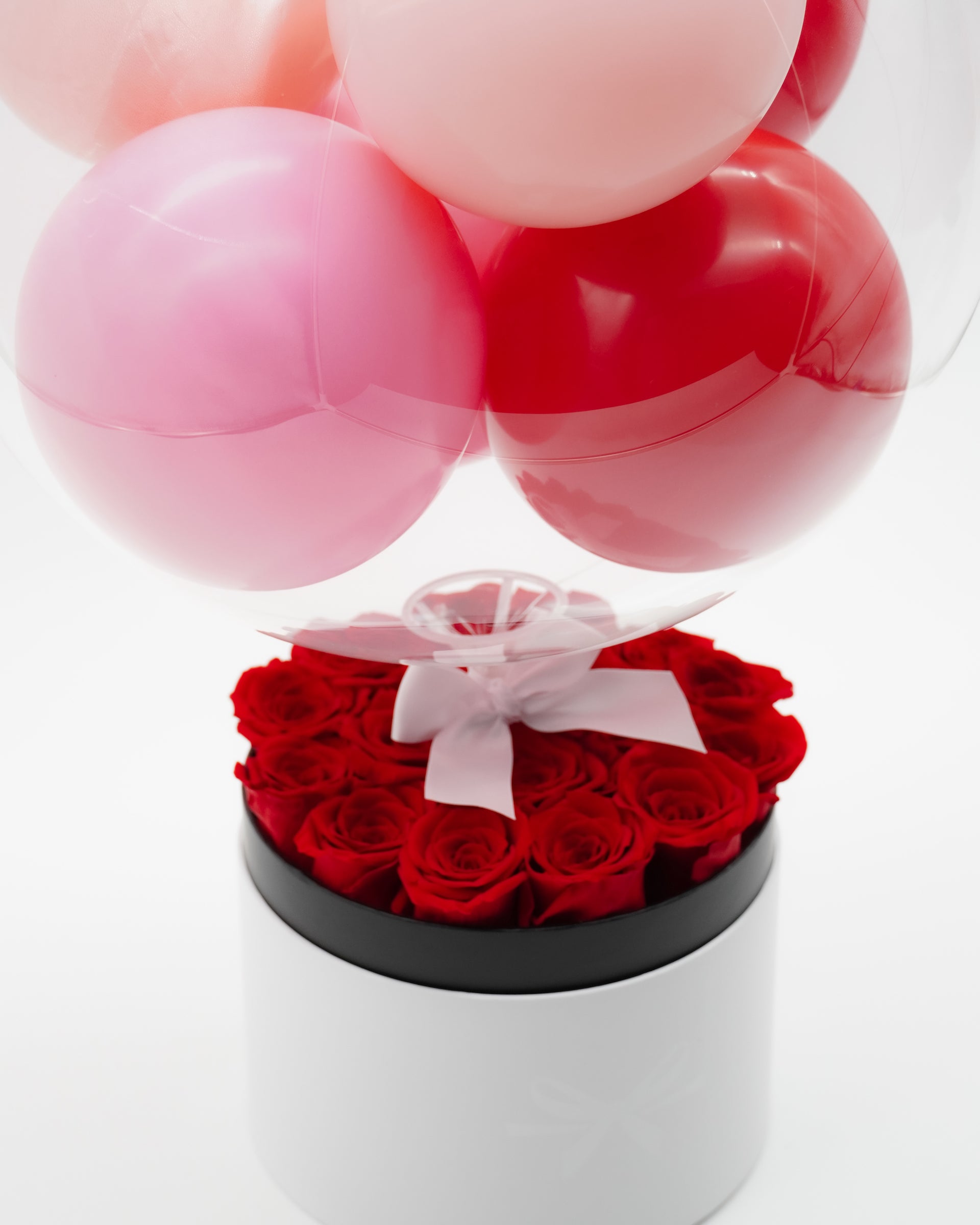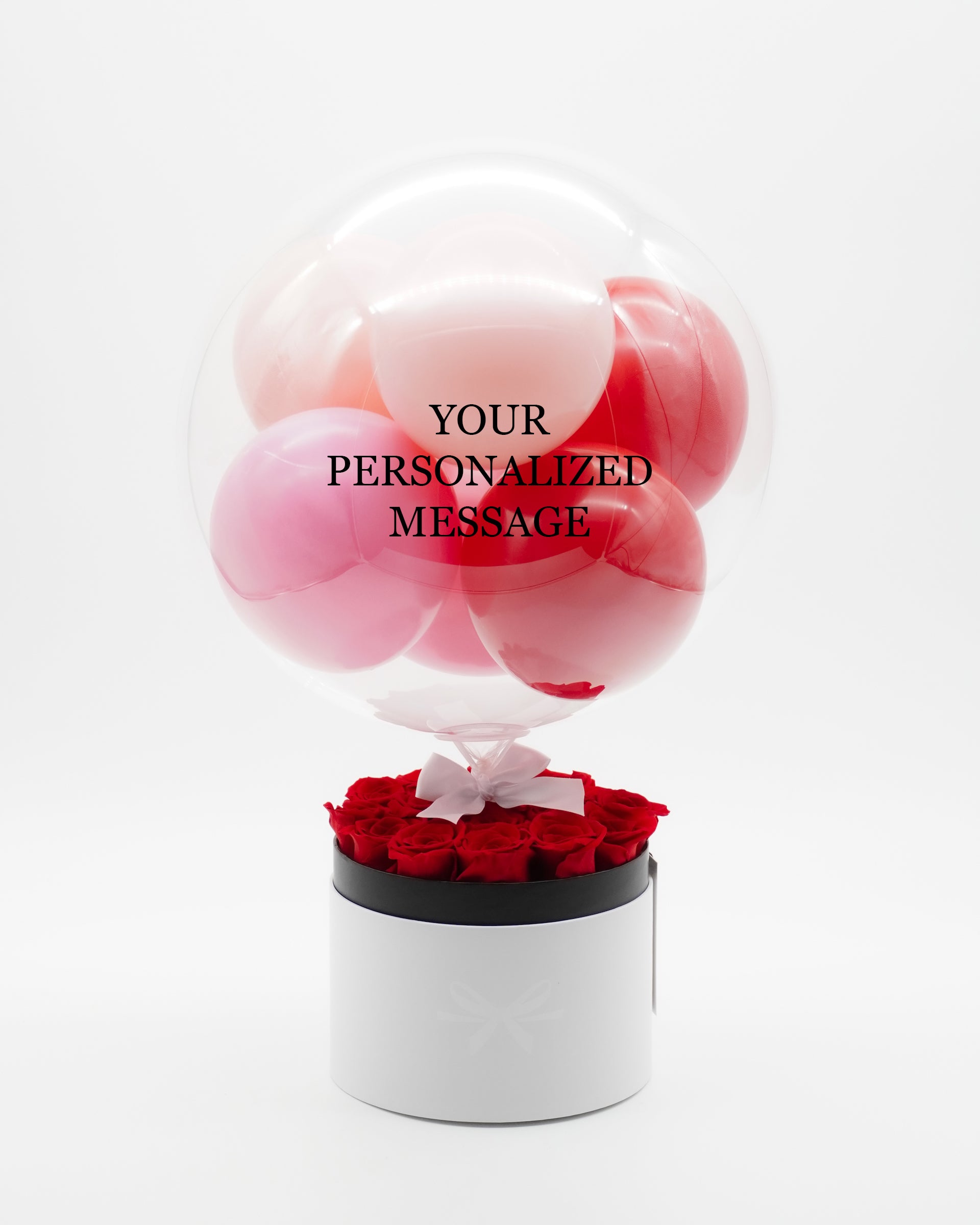 1 medium sized clear latex balloon, 6 mini balloons, 16 scented preserved roses, premium ribbon, your personalized message on the balloon & complimentary card (optional).